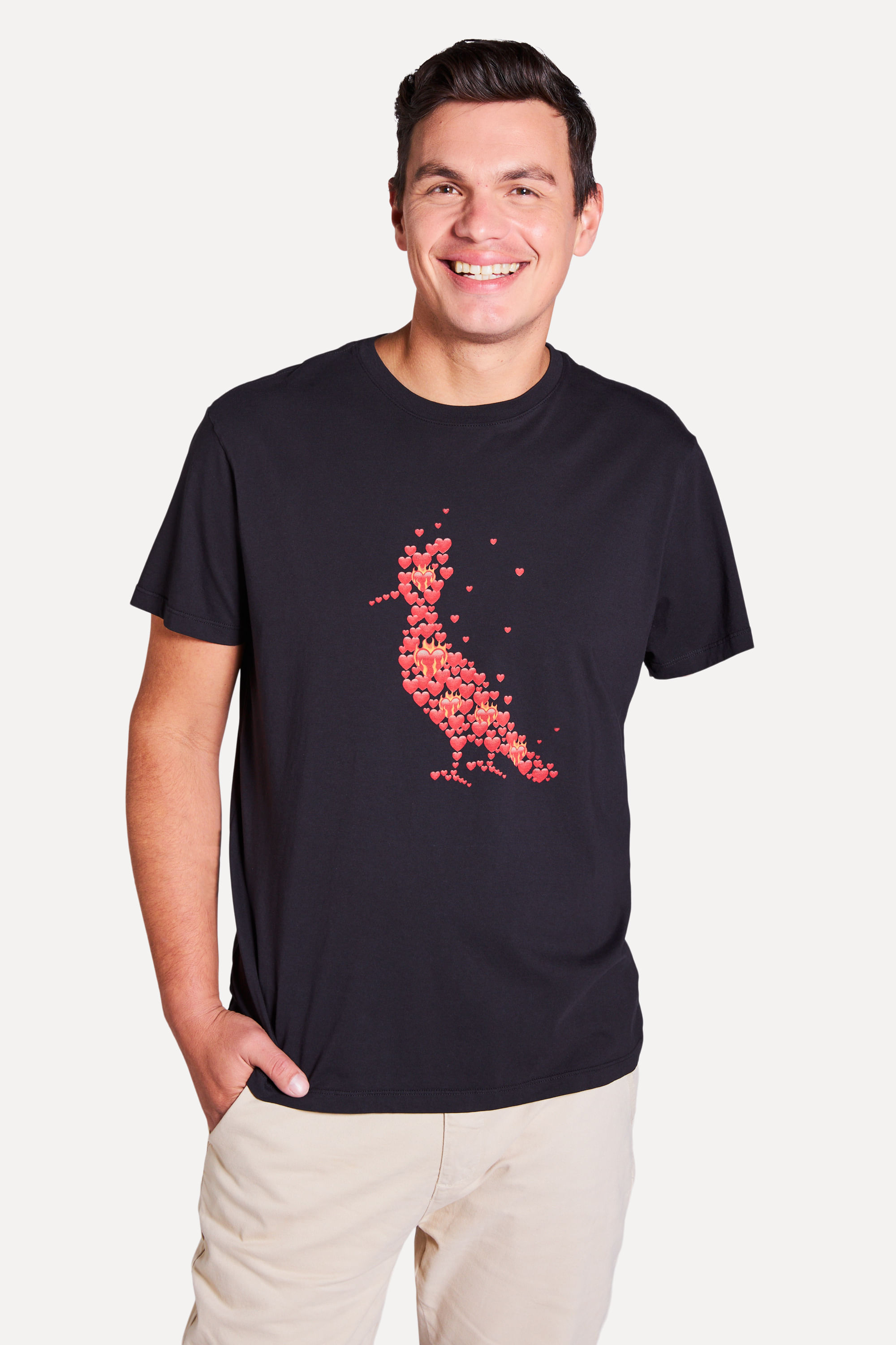 Camiseta manga curta, malha 100% algodão, modelagem regular com a estampa frontal exclusiva do nosso famoso pica pau feitos a partir de emojis de coração e o pica pau na nuca como assinatura traseira.