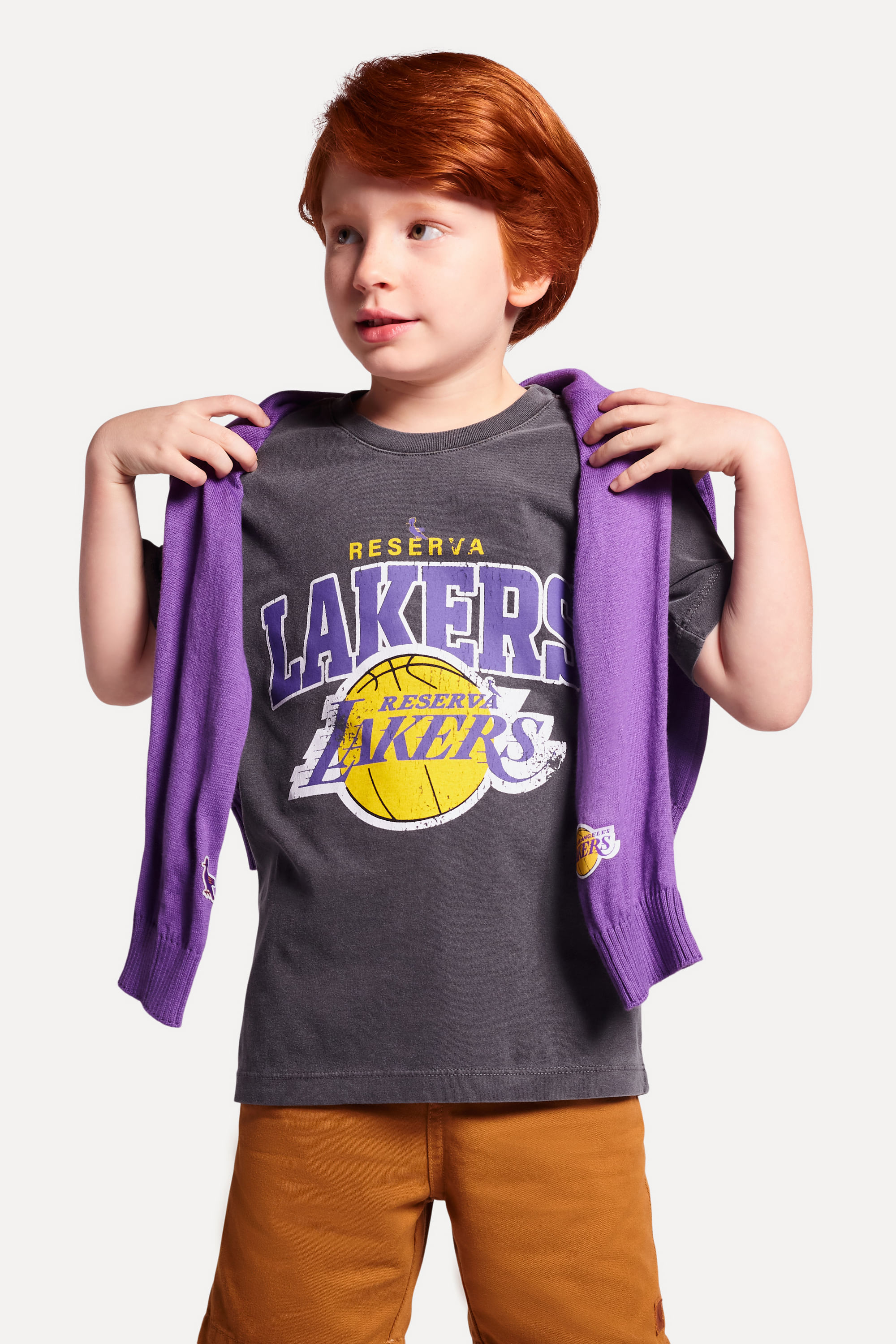 Feita de algodão com detalhe estonado, possui modelagem regular e estampa frontal do clássico escudo dos Lakers. Ideal para os Minis mais descolados e amantes do esporte. Produzido eticamente no Brasil. Comprando esta peça, você complementa cinco pratos de comida através do nosso programa 1P=5P.