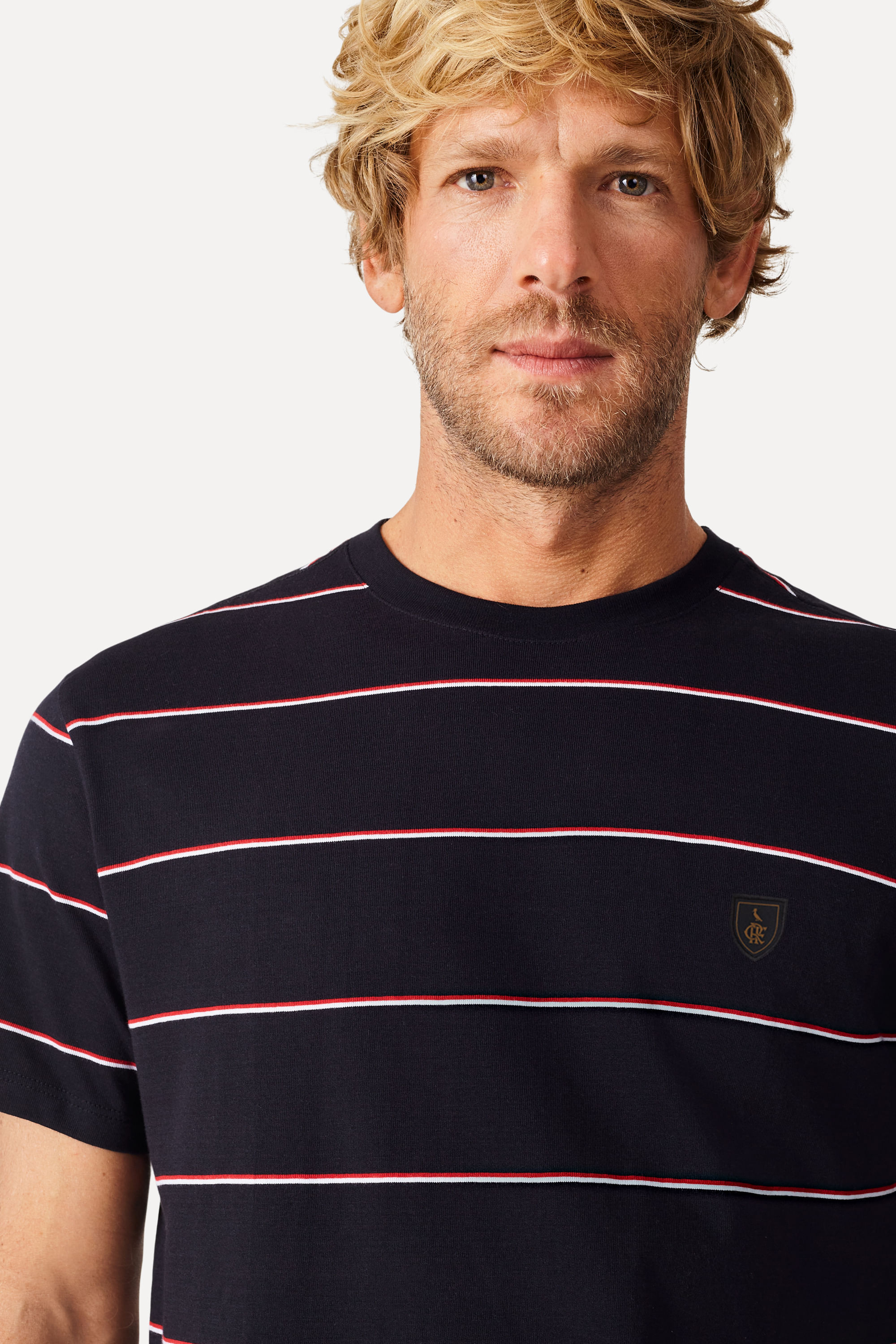 Leve seu amor pelo Mais Querido por onde for com a Camiseta Fio Tinto Listrada Fla! Ela possui manga curta e gola redonda. Na cor preta, ela traz listras vermelhas e, no peito, escudo CRF + pica-pau. Para um jogo no Maraca ou um barzinho, combine com calças ou bermudas, tênis ou chinelos. O modelo tem 1,82 de altura, 98 de tórax e veste 40. Comprando esta peça, você viabiliza cinco pratos de comida através do nosso Programa 1P5P. Camiseta produzido eticamente no Brasil.