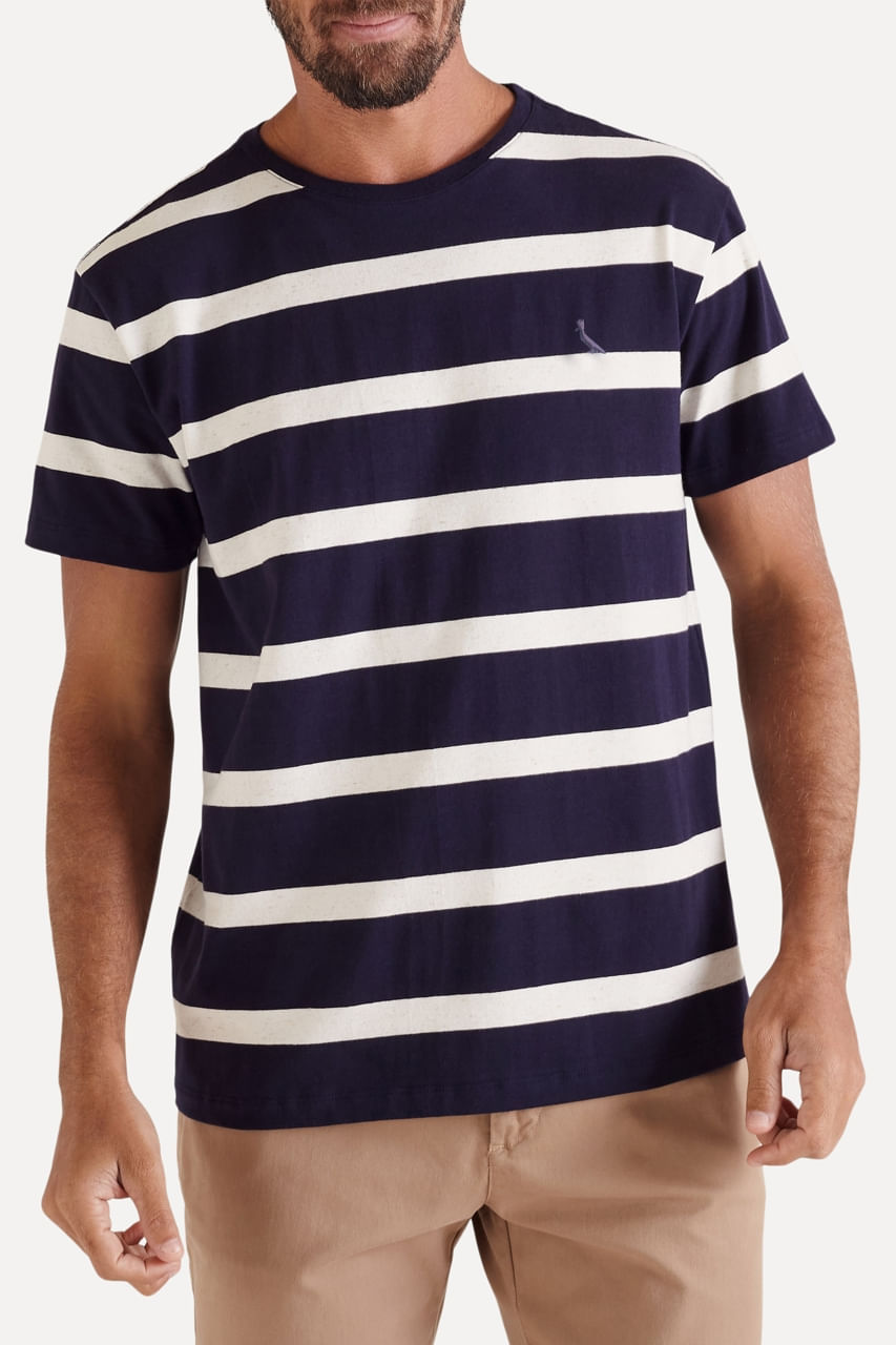 Um churrasquinho com sambinha mais tarde? Camiseta Listrada Joa, pode chegar! Sua composição permite que seus movimentos sejam livres, gerando um conforto sem comparações e ajuste perfeito em todos os formatos de corpo. Desenvolvemos uma camiseta masculina Reserva para você dançar, zoar e até trabalhar num dia mais casual. Listras bonitas assim até te fazem sorrir, fala sério. Produzido eticamente no Brasil. Comprando esta peça, você viabiliza cinco pratos de comida através do nosso programa 1P5P.