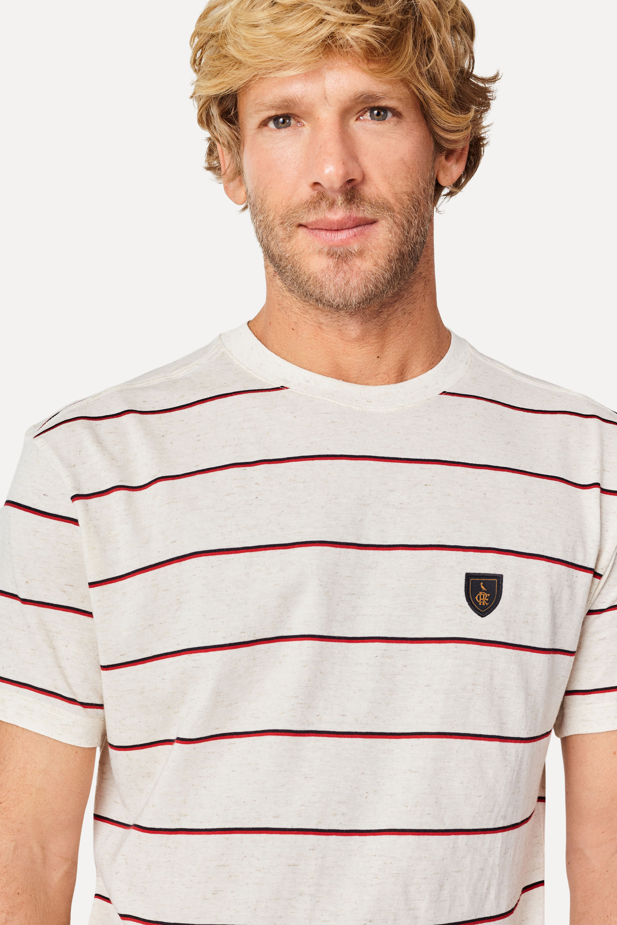 Leve seu amor pelo Mais Querido por onde for com a Camiseta Fio Tinto Listrada Fla! Ela possui manga curta e gola redonda. Na cor preta, ela traz listras vermelhas e, no peito, escudo CRF + pica-pau. Para um jogo no Maraca ou um barzinho, combine com calças ou bermudas, tênis ou chinelos. O modelo tem 1,82 de altura, 98 de tórax e veste 40. Comprando esta peça, você viabiliza cinco pratos de comida através do nosso Programa 1P5P. Camiseta produzido eticamente no Brasil.