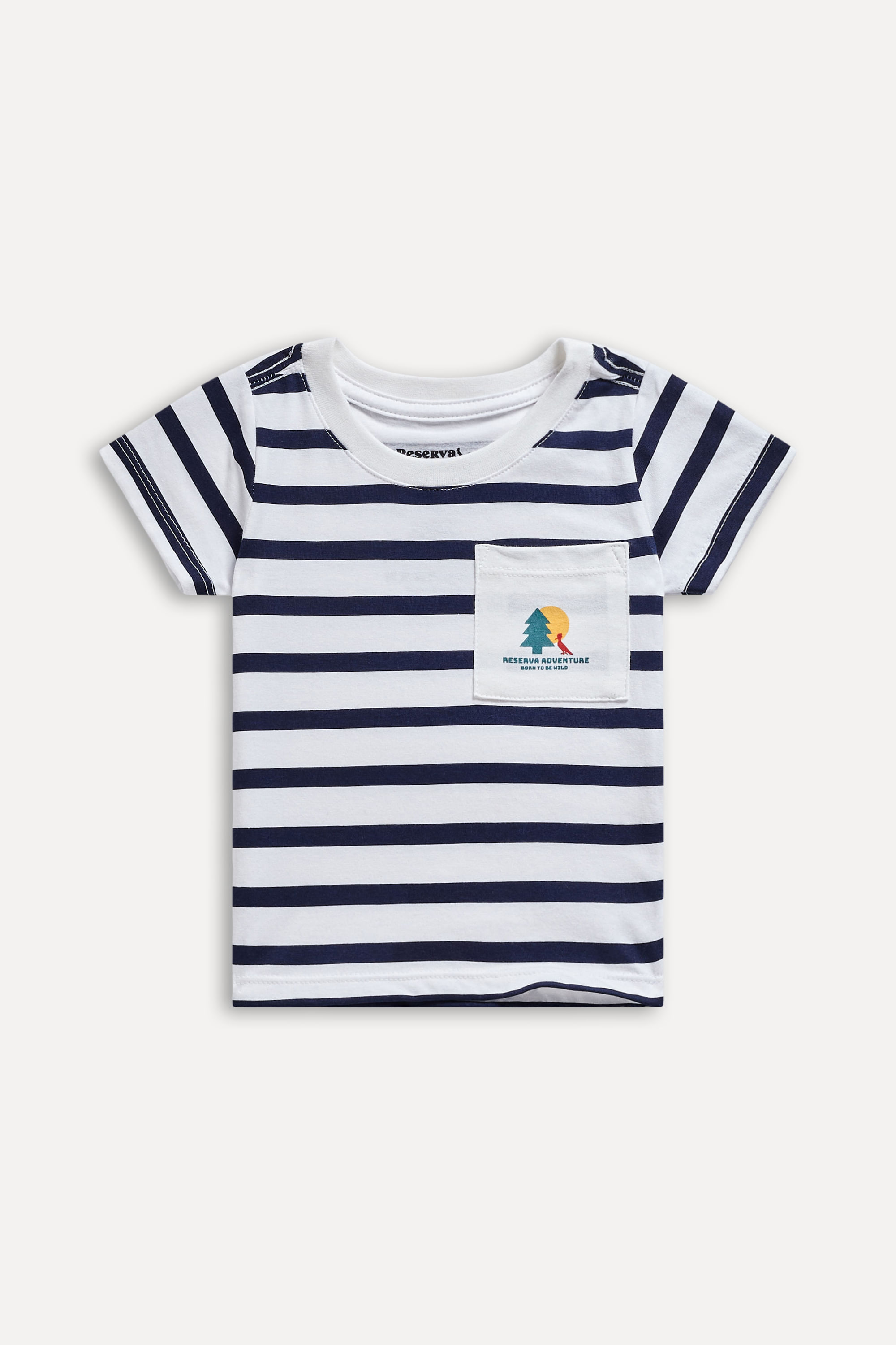 Camiseta de bebê da Reserva Mini. A modelagem com bolsinho em malha 100% algodão de toque macio, com decote redondo de ribana 1x1. Tem estampa de listras na peça toda e uma estampa divertida exclusiva da coleção inverno 24 no bolsinho, que é todo liso (sem as listras) Produzido eticamente no Brasil. Comprando esta peça, você complementa cinco pratos de comida através do nosso programa 1P=5P.
