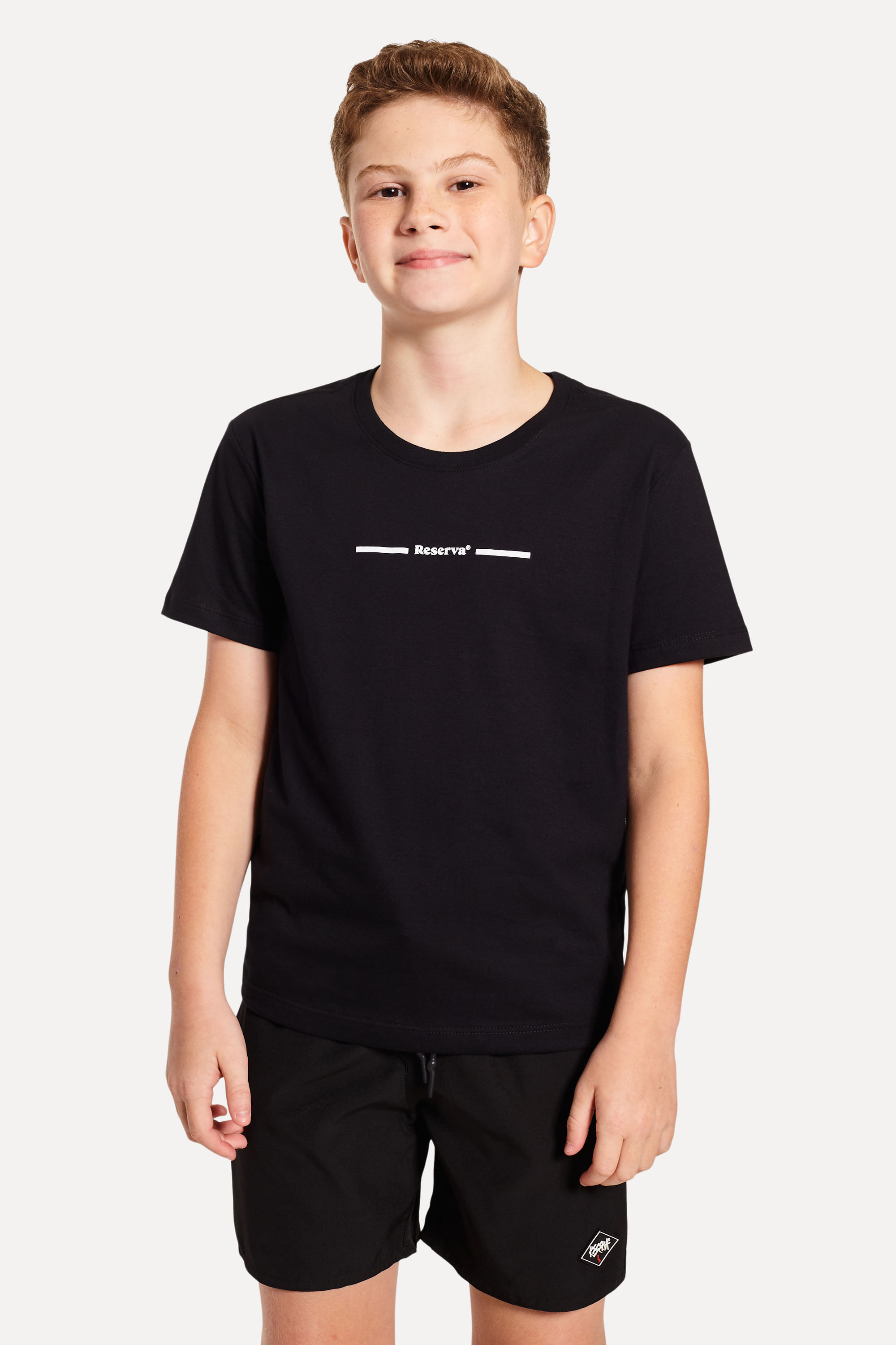 Camiseta da linha infantil Reserva Mini. A modelagem básica em malha 100% algodão de toque macio, com decote redondo e ribana. Tingimento cor firma com cores vibrantes, intensas e resistentes ao desbotamento. Tem assinatura exclusiva da coleção na frente com "reserva" e nas costas com um pica-pau triplo Produzido eticamente no Brasil. Comprando esta peça, você complementa cinco pratos de comida através do nosso programa 1P=5P.