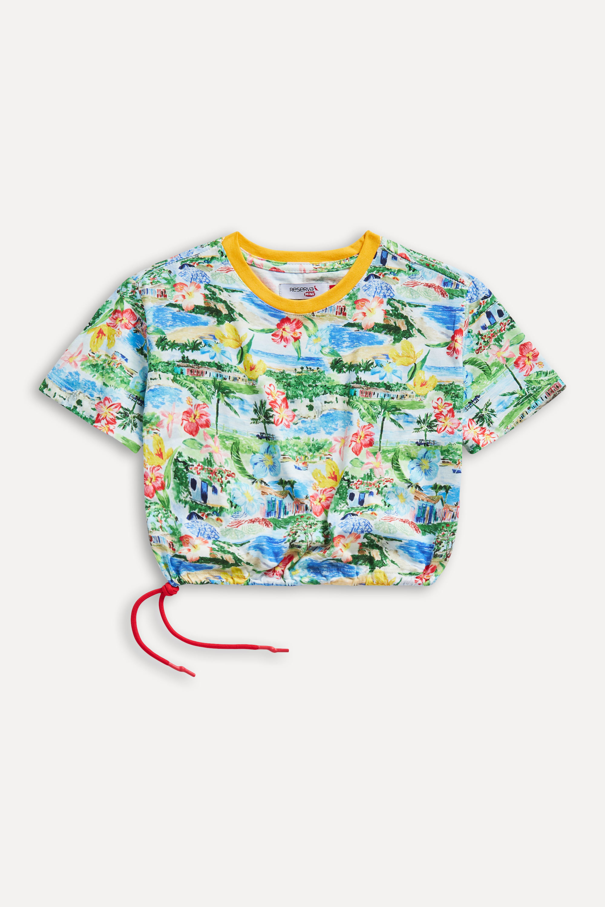 Camiseta cropped estampada da linha infantil Reserva Mini. Peca de malha 100% algodao, com estampa exclusiva da Reserva com uma ilustracao linda da nova colecao. Modelo e cropped e tem um "tunel" na barra com cadarco para dar um lacinho na lateral, o cadarco e colorido, da mesma cor que a gola, combinando com detalhes da estampa.