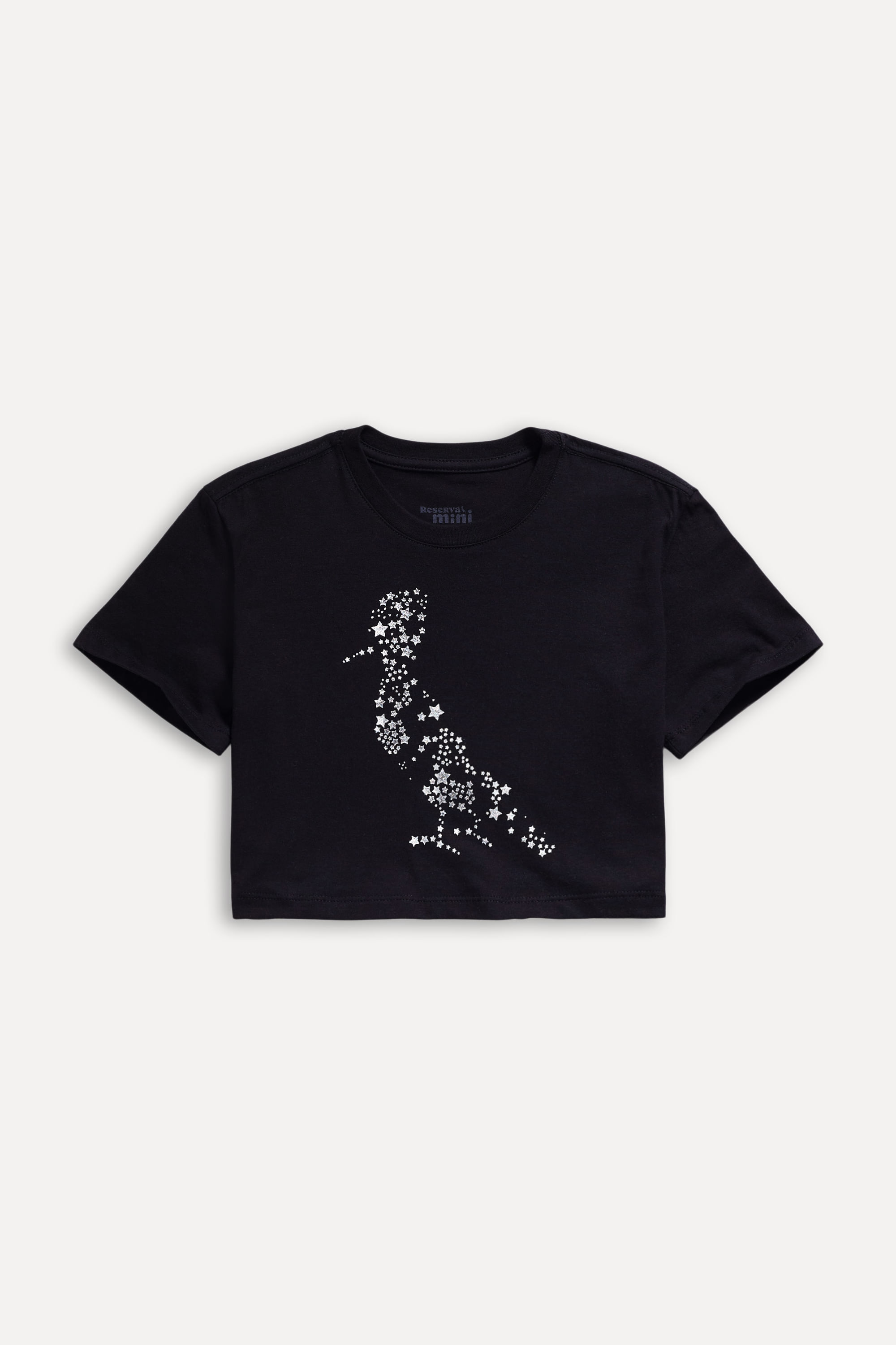 Camiseta cropped da linha menina da Reserva Mini. A modelagem cropped em malha 100% algodão de toque macio, com decote redondo de ribana 1x1. Malha com tingimento reativo, que proporciona cores vibrantes, intensas e resistentes ao desbotamento. Tem estampa de pica-pau divertida exclusiva da coleção inverno 24 com técnica de foil que dá um efeito prateado à estampa Produzido eticamente no Brasil. Comprando esta peça, você complementa cinco pratos de comida através do nosso programa 1P=5P.