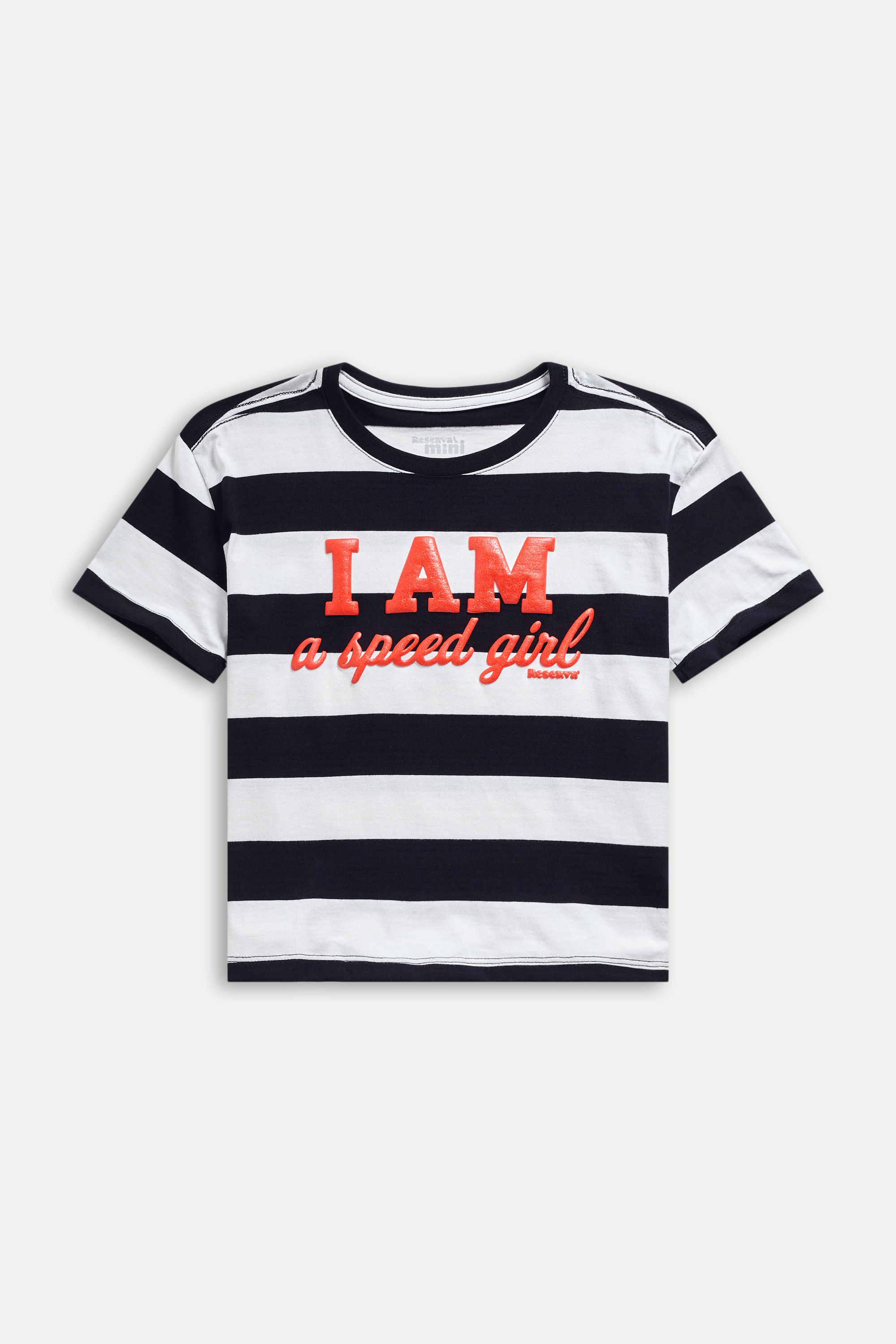 Camiseta estampada da linha para meninas da Reserva mini. Modelo em malha fio tinto PB de manga curta com decote de redondo de ribana 1x1. Estampa exclusiva da reserva com silk puff e glitter por cima das listras Produzido eticamente no Brasil. Comprando esta peça, você complementa cinco pratos de comida através do nosso programa 1P=5P.