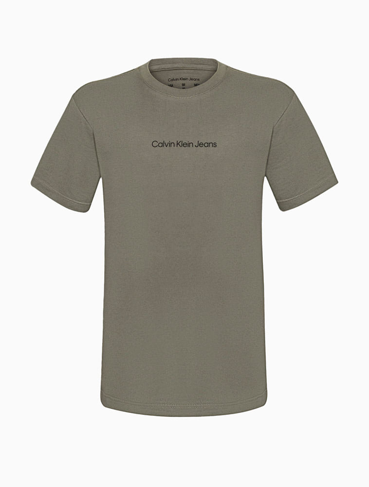 Camiseta Calvin Klein Jeans manga curta de meia malha, gola Ribana, e estampa exclusiva da marca. Modelagem básica.