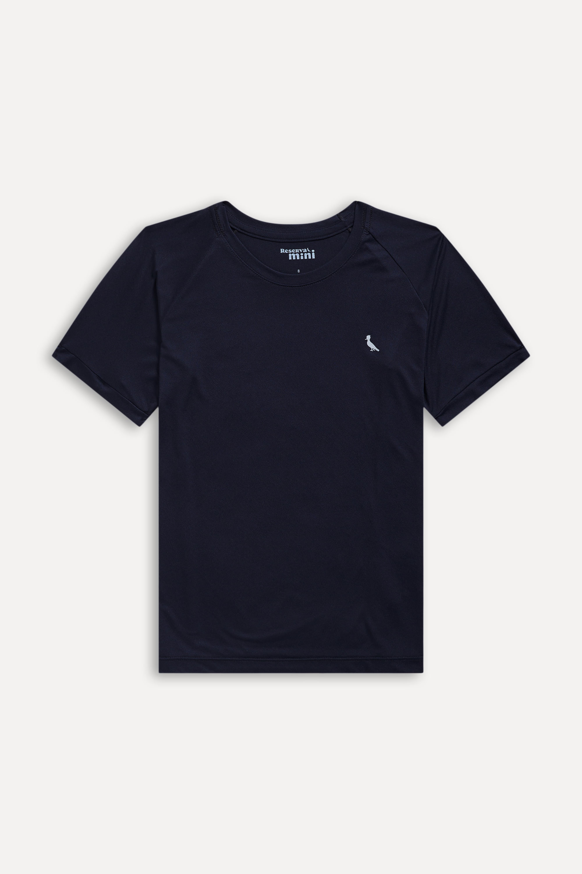 Camiseta da linha infantil Reserva Mini. O modelo é com malha dry fit, decote careca, manga raglan com punhos e pica-pau em técnica refletiva aplicado no peito. A malha dry fit tem tecnologia que seca rápido e é ideal para a prática exercícios físicos. Produzido eticamente no Brasil. Comprando esta peça, você complementa cinco pratos de comida através do nosso programa 1P=5P.