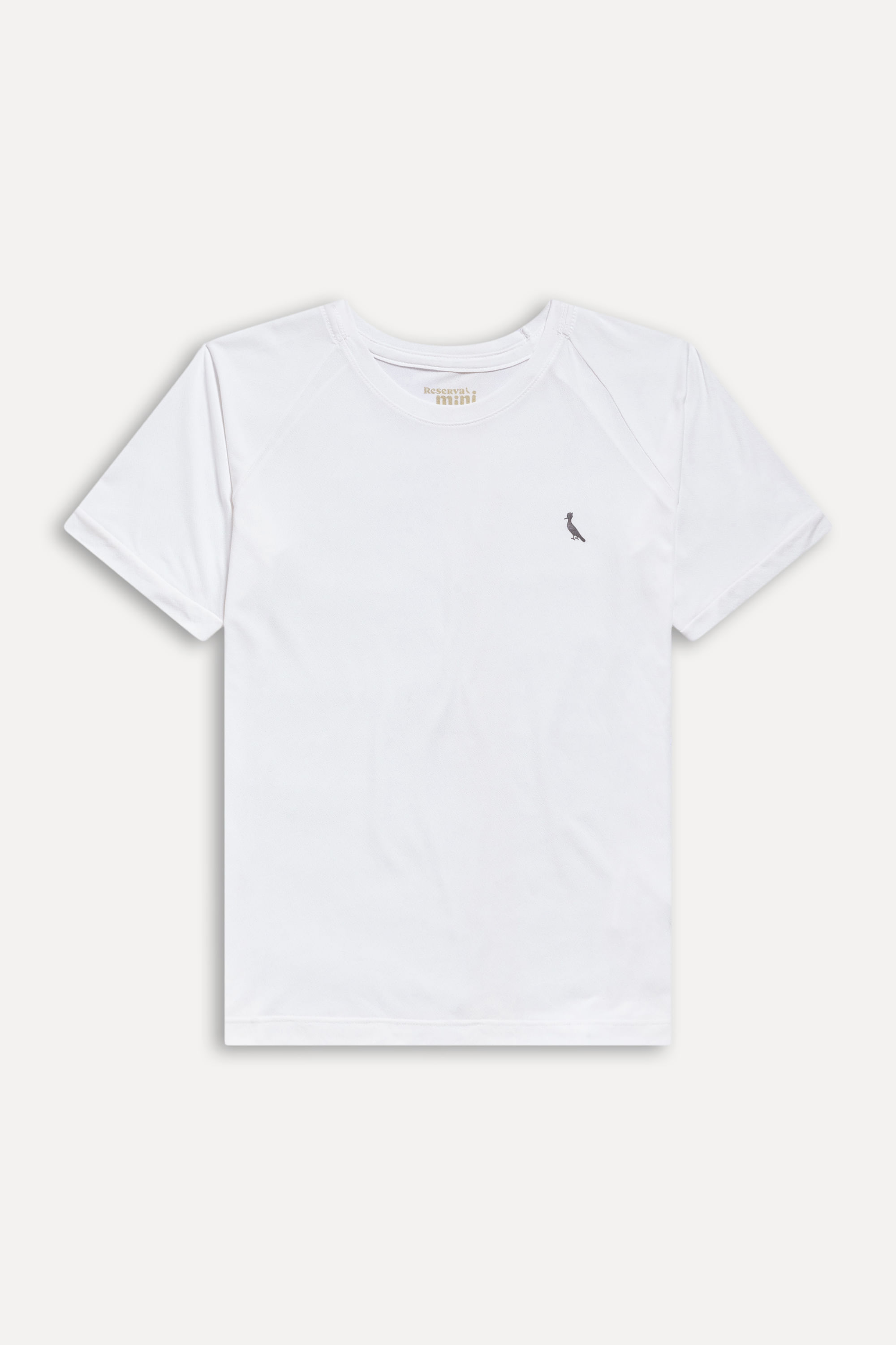 Camiseta da linha infantil Reserva Mini. O modelo é com malha dry fit, decote careca, manga raglan com punhos e pica-pau em técnica refletiva aplicado no peito. A malha dry fit tem tecnologia que seca rápido e é ideal para a prática exercícios físicos. Produzido eticamente no Brasil. Comprando esta peça, você complementa cinco pratos de comida através do nosso programa 1P=5P.