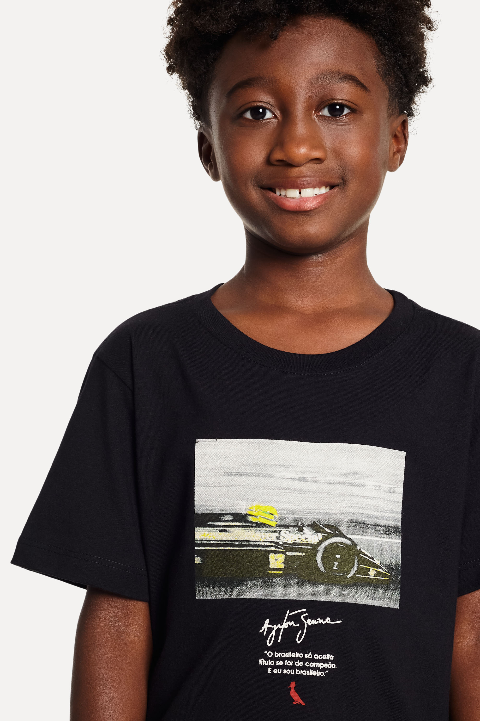 Das manhãs de domingo para a eternidade! Conheça a Camiseta Estampada Retrato Senna, feita para os novos fãs de um dos maiores pilotos de Fórmula 1 da história. Feita em malha 100% algodão, manga curta, gola redonda de ribana de algodão e modelagem regular, que oferece caimento reto no corpo. Sua estampa traz o Ayrton pilotando seu icônico carro preto da Lotus, acompanhado da sua assinatura oficial e do nosso pica-pau vermelho. Disponível em 2 cores, escolha qual combina mais com o estilo do Mini. Combine com calças ou bermudas, tênis ou chinelos e acelere! Comprando esta peça, você viabiliza cinco pratos de comida através do nosso Programa 1P5P. Camiseta produzida eticamente no Brasil.