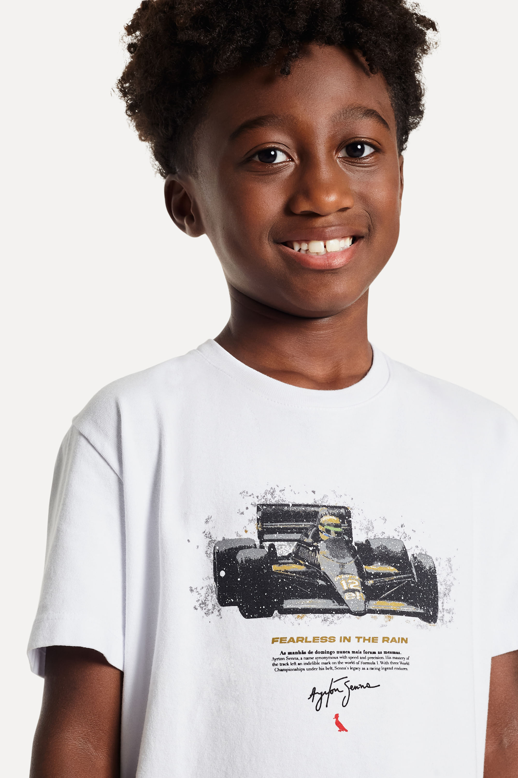 Das manhãs de domingo para a eternidade! Conheça a Camiseta Fearless in The Rain Senna, feita para os novos fãs de um dos maiores pilotos de Fórmula 1 da história. Feita em malha 100% algodão, manga curta, gola redonda de ribana de algodão e modelagem regular, que oferece caimento reto no corpo. Sua estampa traz Ayrton em sua Lotus com a frase “Fearless in The Rain” (Destemido na chuva, em tradução), homenageando sua habilidade única em corridas na chuva. Disponível em 2 cores, escolha qual combina mais o estilo do Mini. Combine com calças ou bermudas, tênis ou chinelos e acelere! Comprando esta peça, você viabiliza cinco pratos de comida através do nosso Programa 1P5P. Camiseta produzida eticamente no Brasil.