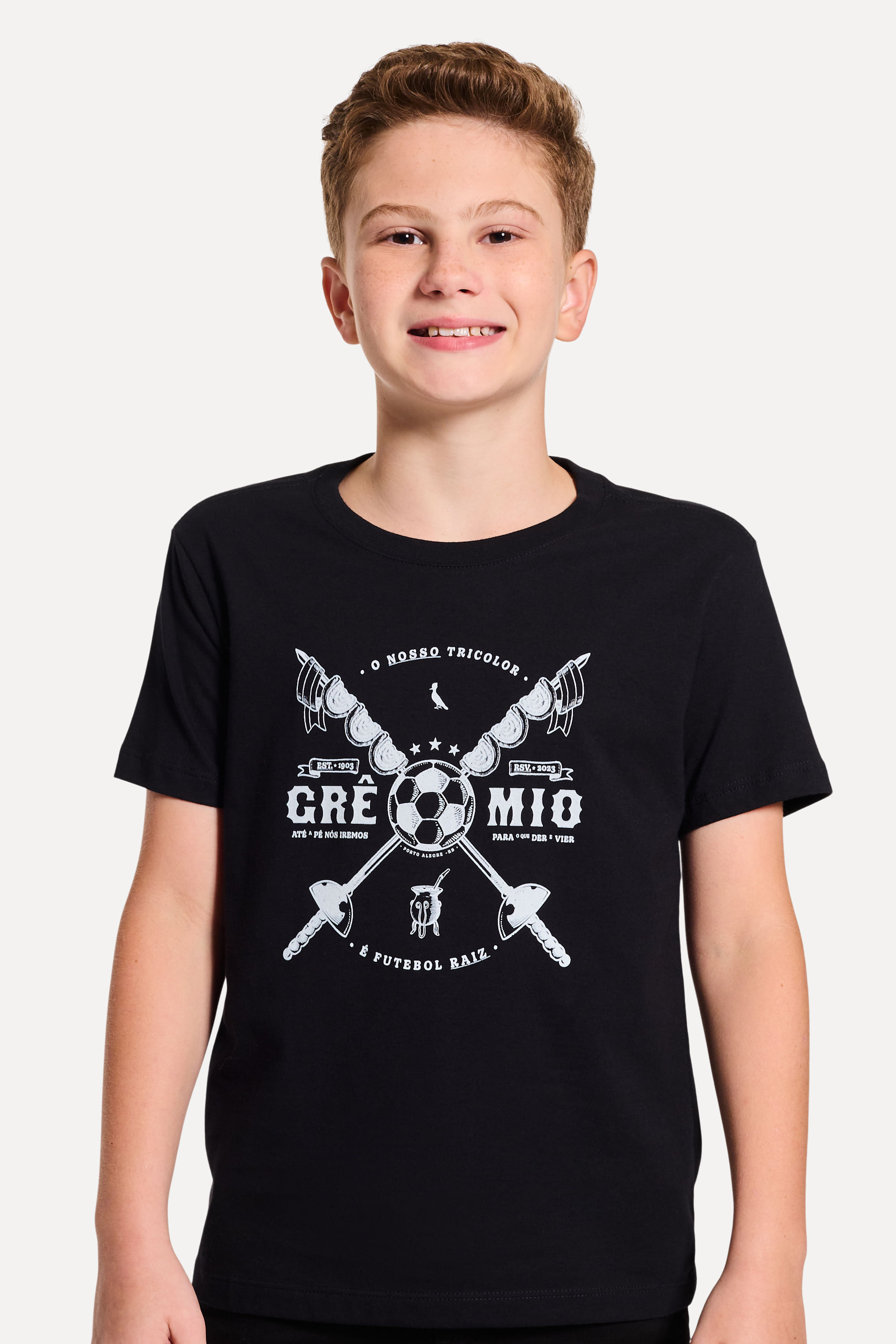 O Mini com o Grêmio em todo lugar usando a Camiseta Mini Futebol Raiz Grêmio! Feita em algodão, possui manga curta e gola redonda de ribana. No centro, está estampado: dois espetos de churrasco que se cruzam em uma bola de futebol; as frases “o nosso tricolor é futebol raiz” e “até a pé nós iremos para o que der e vier”; um chimarrão e detalhes exclusivos Grêmio e Reserva. Perfeita para um dia de brincadeiras ou pro jogo do Imortal Tricolor, combine com calças ou bermudas, tênis ou chinelos. Comprando esta peça, você viabiliza cinco pratos de comida através do nosso Programa 1P5P. Camiseta produzida eticamente no Brasil.