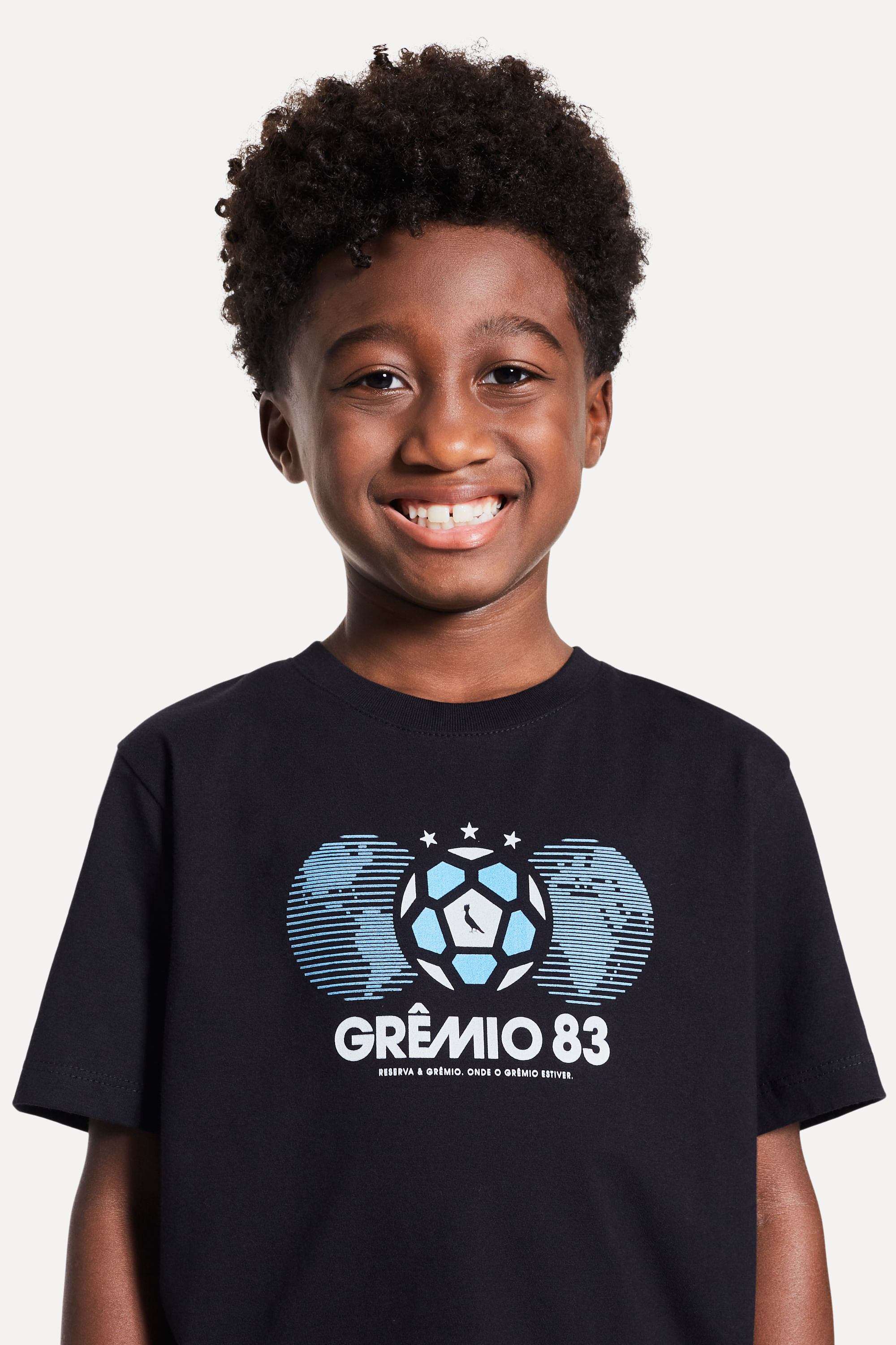 O Mini com o Grêmio em todo lugar usando a Camiseta Mini Grêmio 83! Feita em algodão, possui manga longa e gola redonda de ribana. No centro, está estampada, em estilo retrô, as frases “Grêmio 83” e “Reserva e Grêmio. Onde o Grêmio estiver” e o mapa mundi, relembrando o ano em que o mundo se pintou de azul, brando e preto. Perfeita para um dia de brincadeiras ou pro jogo do Imortal Tricolor, combine com calças ou bermudas, tênis ou chinelos. Comprando esta peça, você viabiliza cinco pratos de comida através do nosso Programa 1P5P. Camiseta produzida eticamente no Brasil.