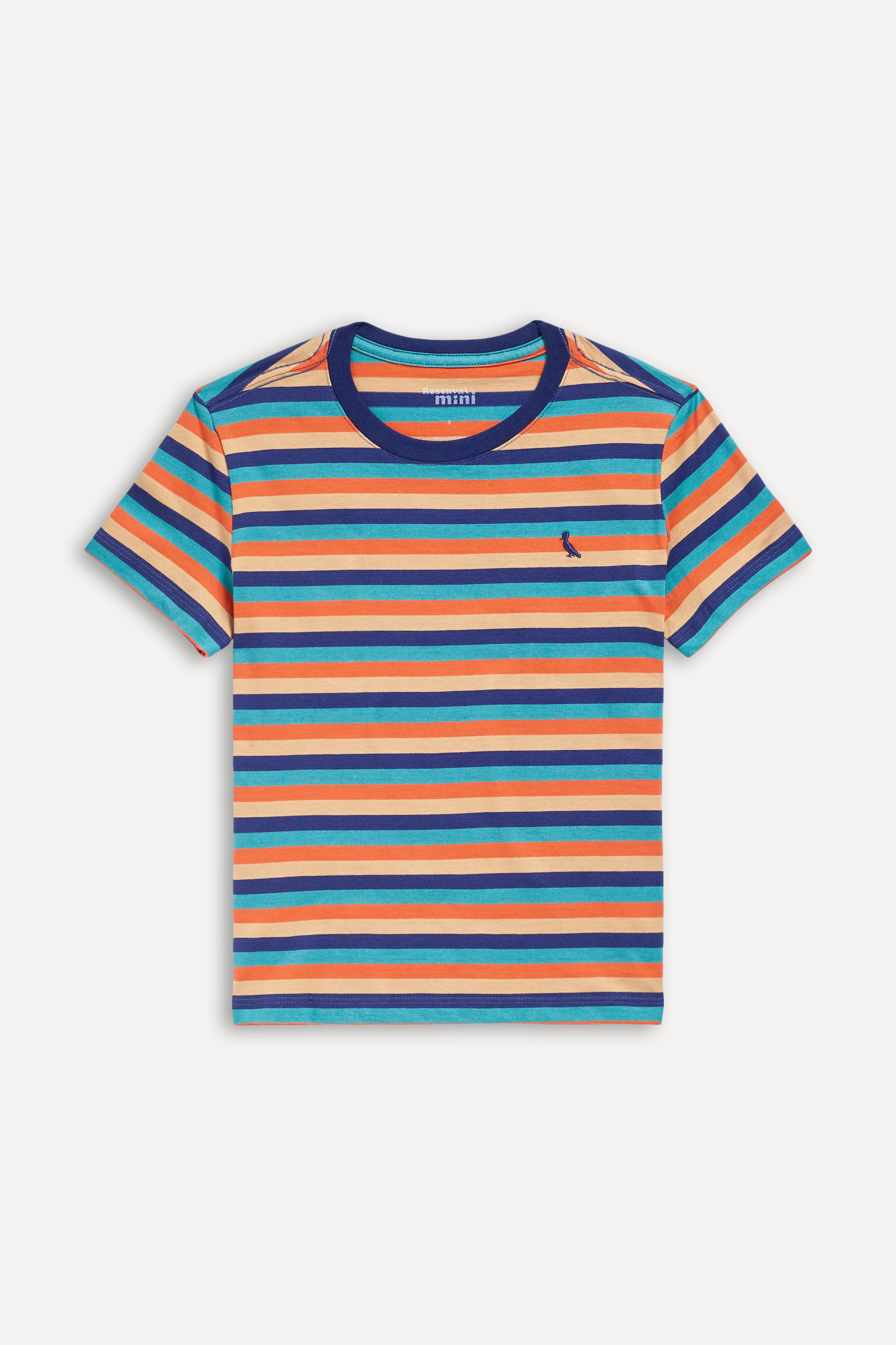 Camiseta infantil em modelagem básica de manga curta com listras de fio tinto, feita com fios tingidos individualmente, em cores da nossa cartela de inverno do tema camp. Gola de ribana e decote recondo. Peça assinada com bordado de pica-pau no peito. Produzido eticamente no Brasil. Comprando esta peça, você complementa cinco pratos de comida através do nosso programa 1P=5P.