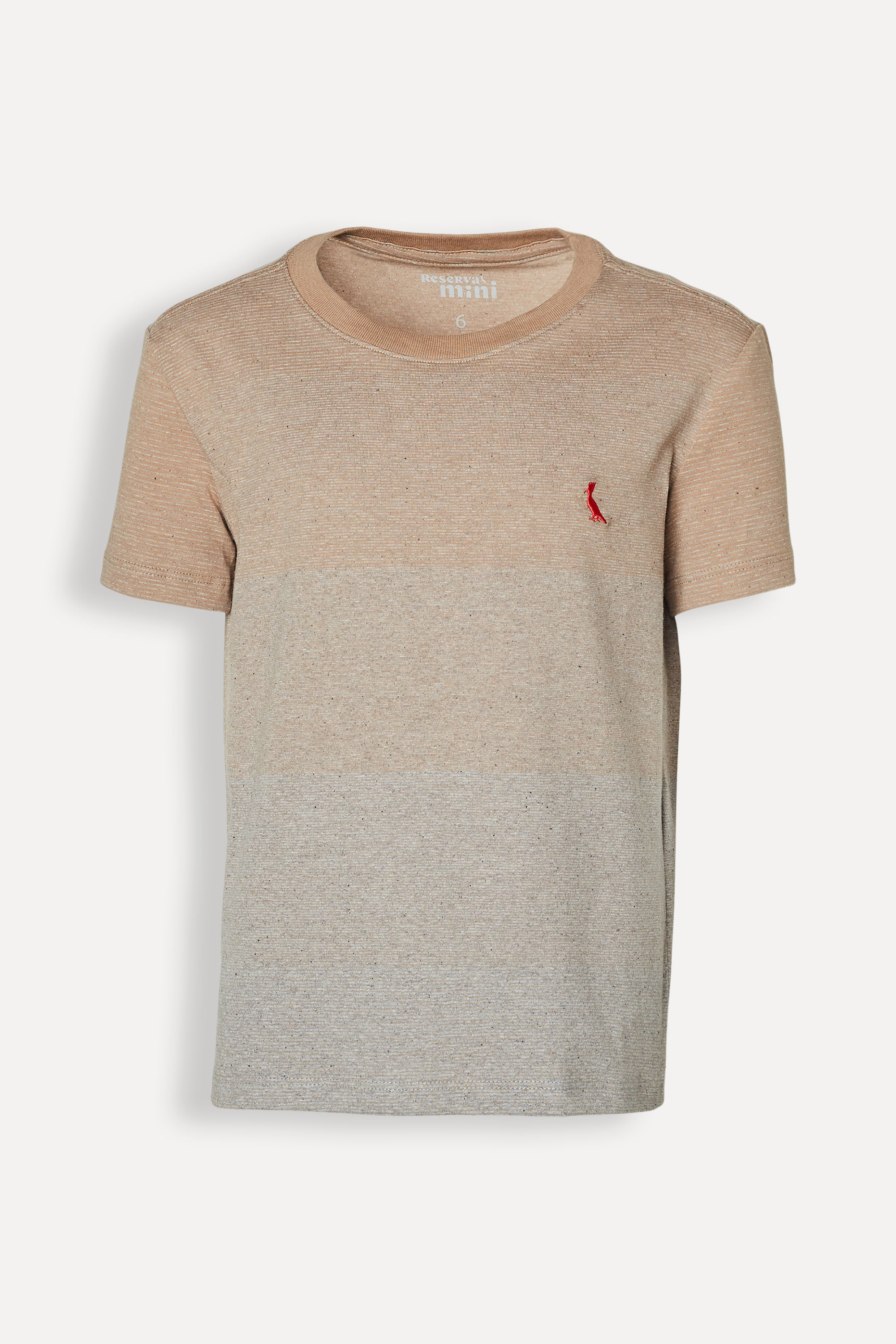 Procurando camiseta pro dia a dia do Mini? Então conheça a Camiseta Mini Listra Degradê! Feita em algodão de alta qualidade, proporciona muito conforto. Possui manga curta e gola redonda em ribana. Combine com calças ou bermudas, tênis ou chinelos e agasalhos. Comprando esta peça, você viabiliza cinco pratos de comida através do nosso Programa 1P5P. Camiseta produzida eticamente no Brasil.