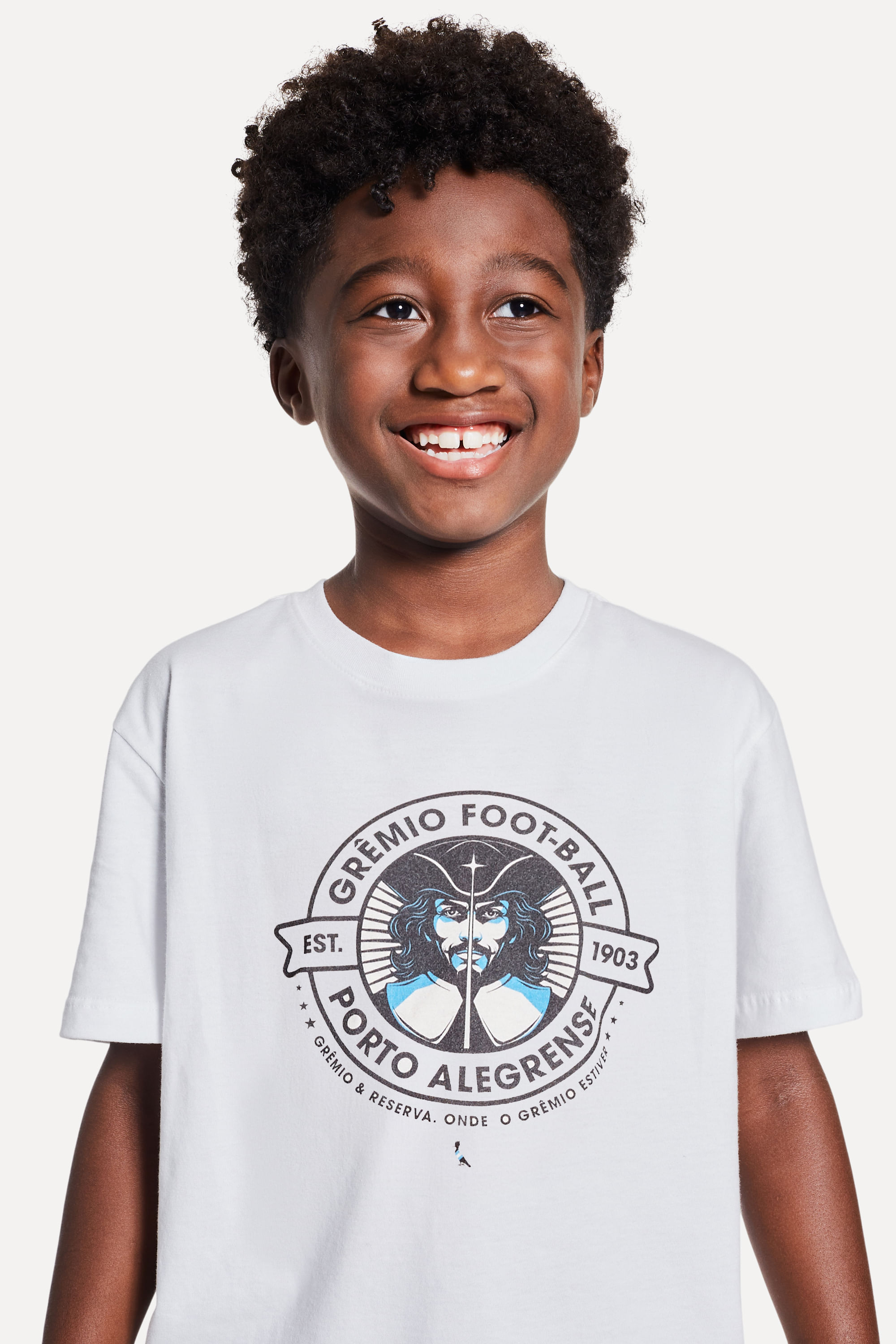 O Mini com o Grêmio em todo lugar usando a Camiseta Mini Mosqueteiro Redondo Grêmio! Feita em algodão, possui manga longa e gola redonda de ribana. No centro, está estampado o mosqueteiro dentro de um círculo. Em volta, está escrito “Grêmio Foot-ball Porto Alegrense”. Por fora, está escrito “Grêmio e Reserva, onde o Grêmio estiver”. Perfeita para um dia de brincadeiras ou pro jogo do Imortal Tricolor, combine com calças ou bermudas, tênis ou chinelos. Comprando esta peça, você viabiliza cinco pratos de comida através do nosso Programa 1P5P. Camiseta produzida eticamente no Brasil.