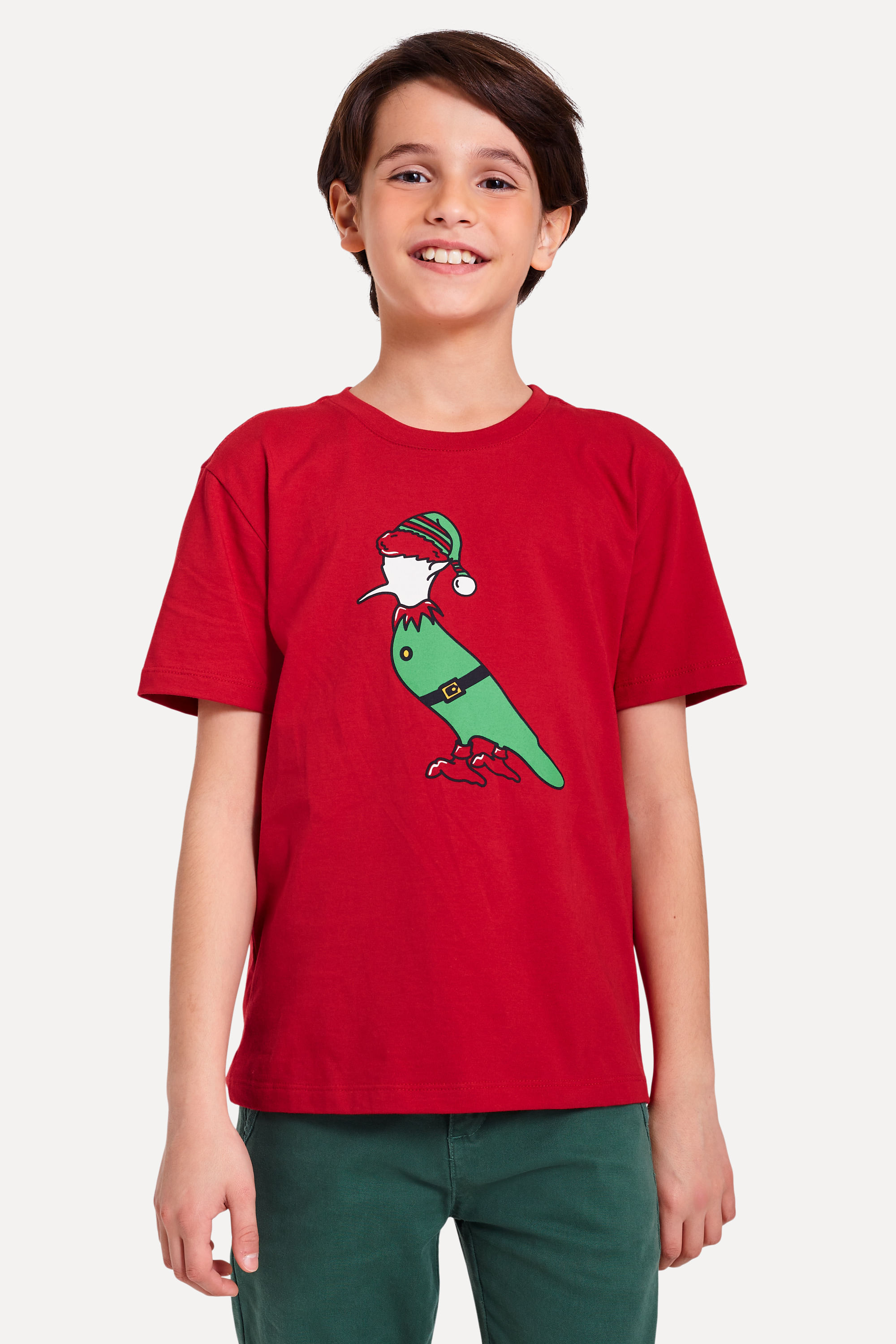 Camiseta infantil estampada confeccionada em malha 100% algodão que garante mais frescor. Essa camiseta possui manga curta, gola redonda de ribana de algodão e modelagem regular, que oferece caimento reto no corpo. A estampa é exclusiva da Reserva Mini, tema especial natalino, que possui o nosso famoso pica pau vestido de duende.