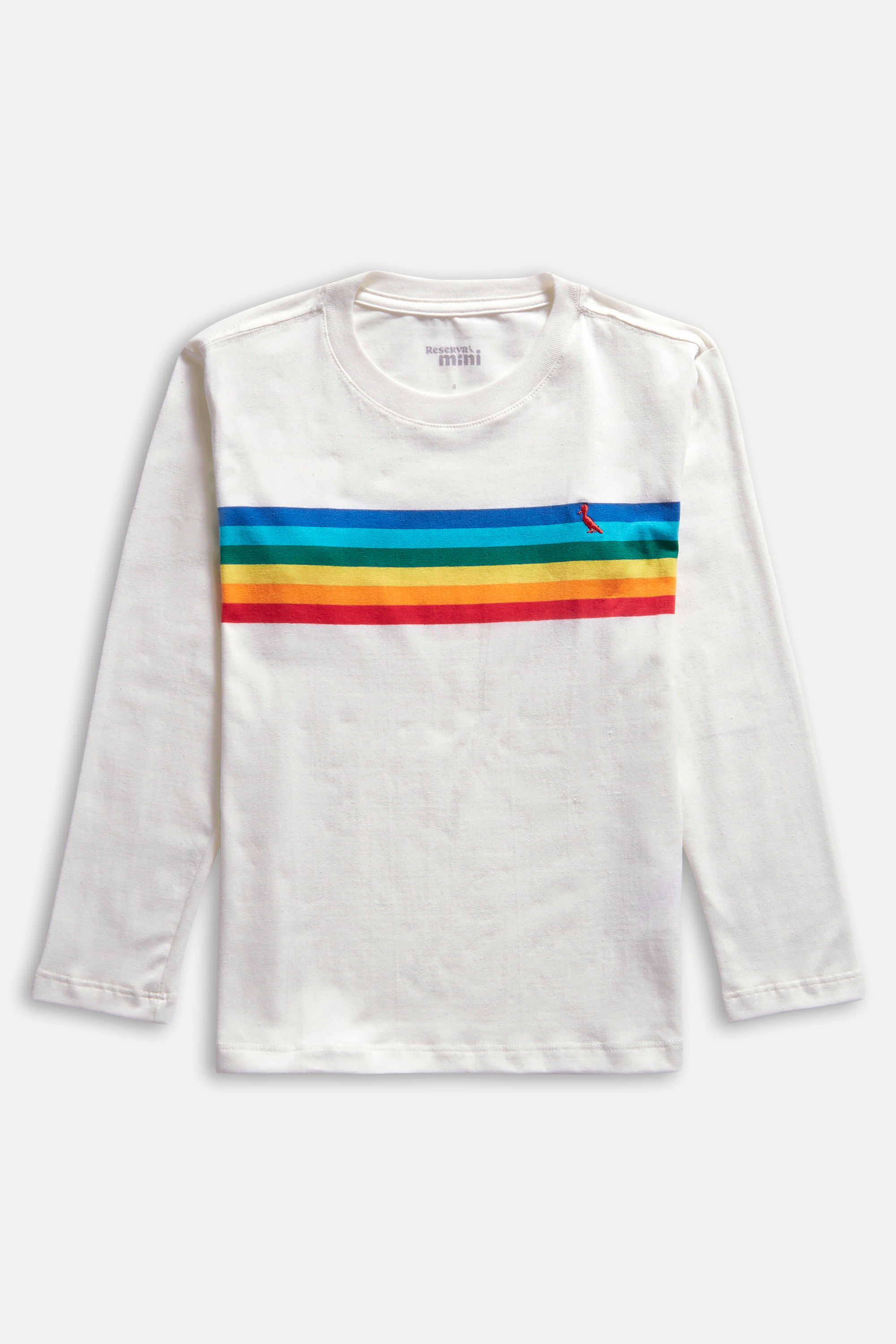 Camiseta da linha infantil Reserva Mini. A modelagem tradicional com mangas longas ganhou listras coloridas que dão um up a qualquer visual. Perfeita para o dia a dia cheio de aventuras! Produzido eticamente no Brasil. Comprando esta peça, você complementa cinco pratos de comida através do nosso programa 1P=5P.