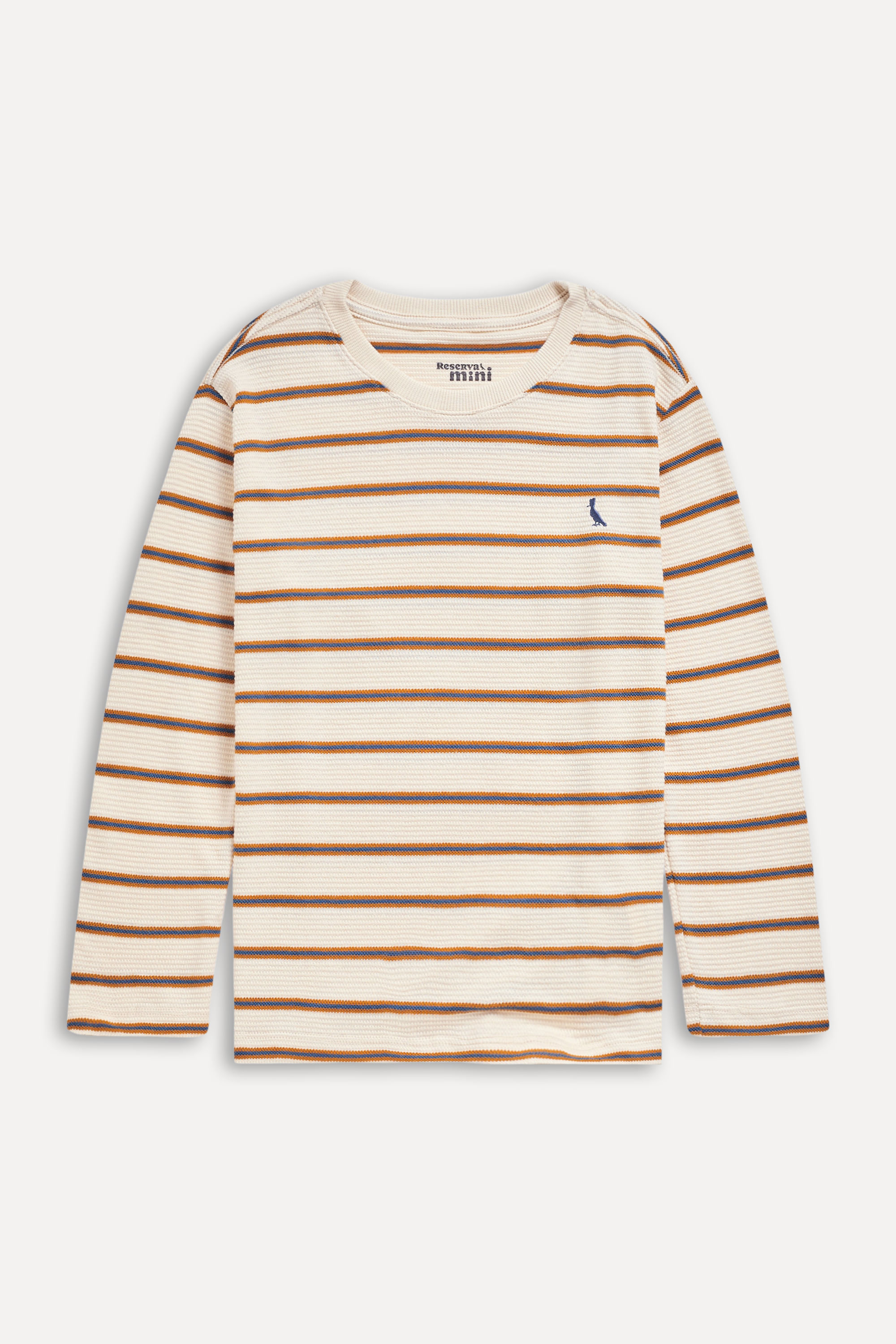 Camiseta infantil de manga longa de malhão com listras de fio tinto, feita com fios tingidos individualmente, em cores da nossa cartela de inverno do tema camp em uma malha com textura, super especial, mais encorpadinha. Gola de ribana e decote recondo. Peça assinada com bordado de pica-pau no peito e possui fenda lateral. Produzido eticamente no Brasil. Comprando esta peça, você complementa cinco pratos de comida através do nosso programa 1P=5P.