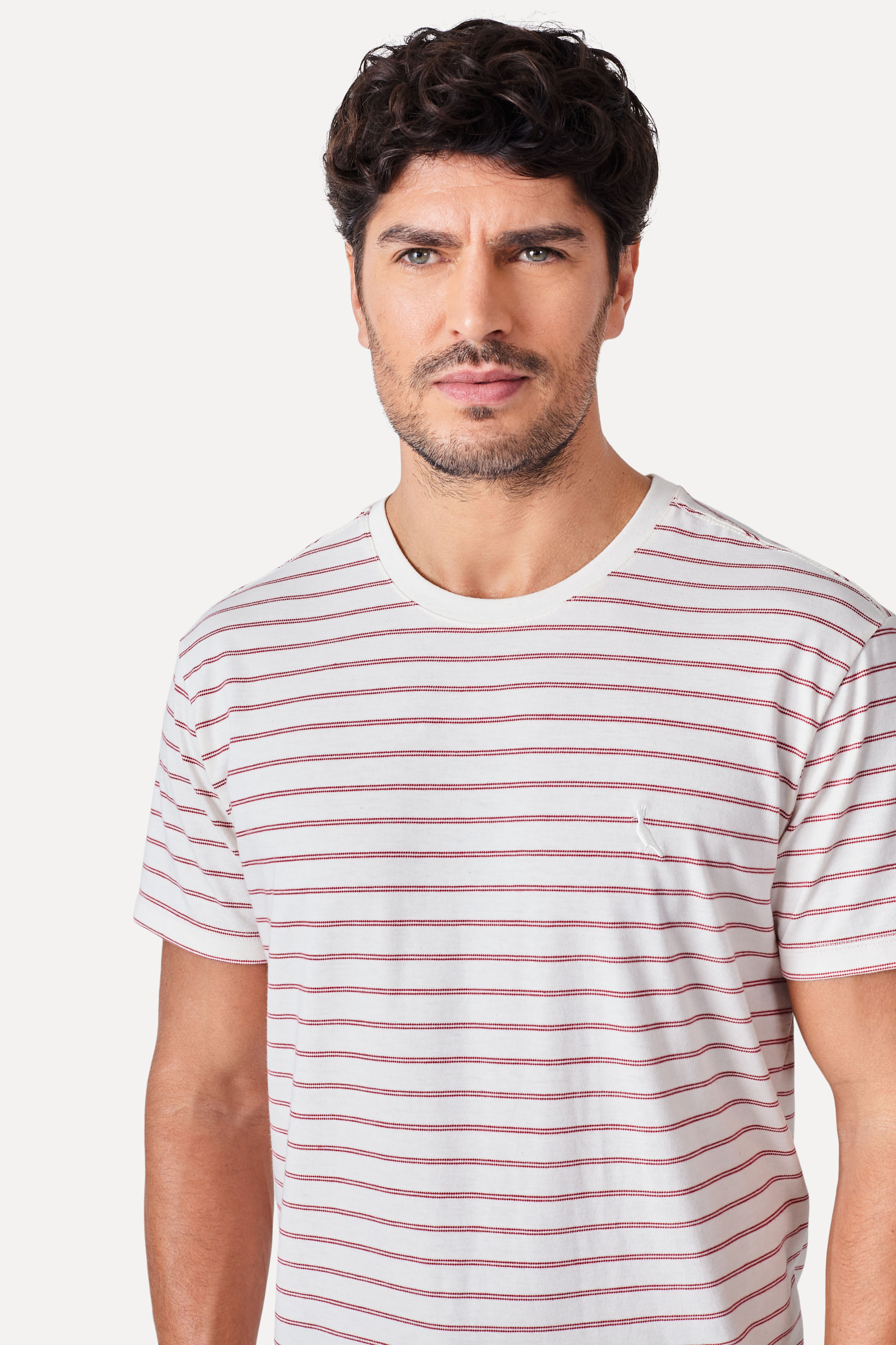 A Camiseta Regular Listrado Fresh é perfeita para compor looks urbanos e cheios de personalidade. Confeccionada em malha mista de algodão fio tinto, possui listrado fino e texturizado, além de caimento reto, gola redonda, mangas curtas e clássico pica-pau bordado no peito. Combine com calças jeans, bermudas, jaquetas, tênis, bonés e muito mais! O modelo tem 1,84 de altura, 103 de tórax e veste 42. Comprando esta peça, você viabiliza cinco pratos de comida através do nosso Programa 1P5P. Camiseta produzida eticamente no Brasil.