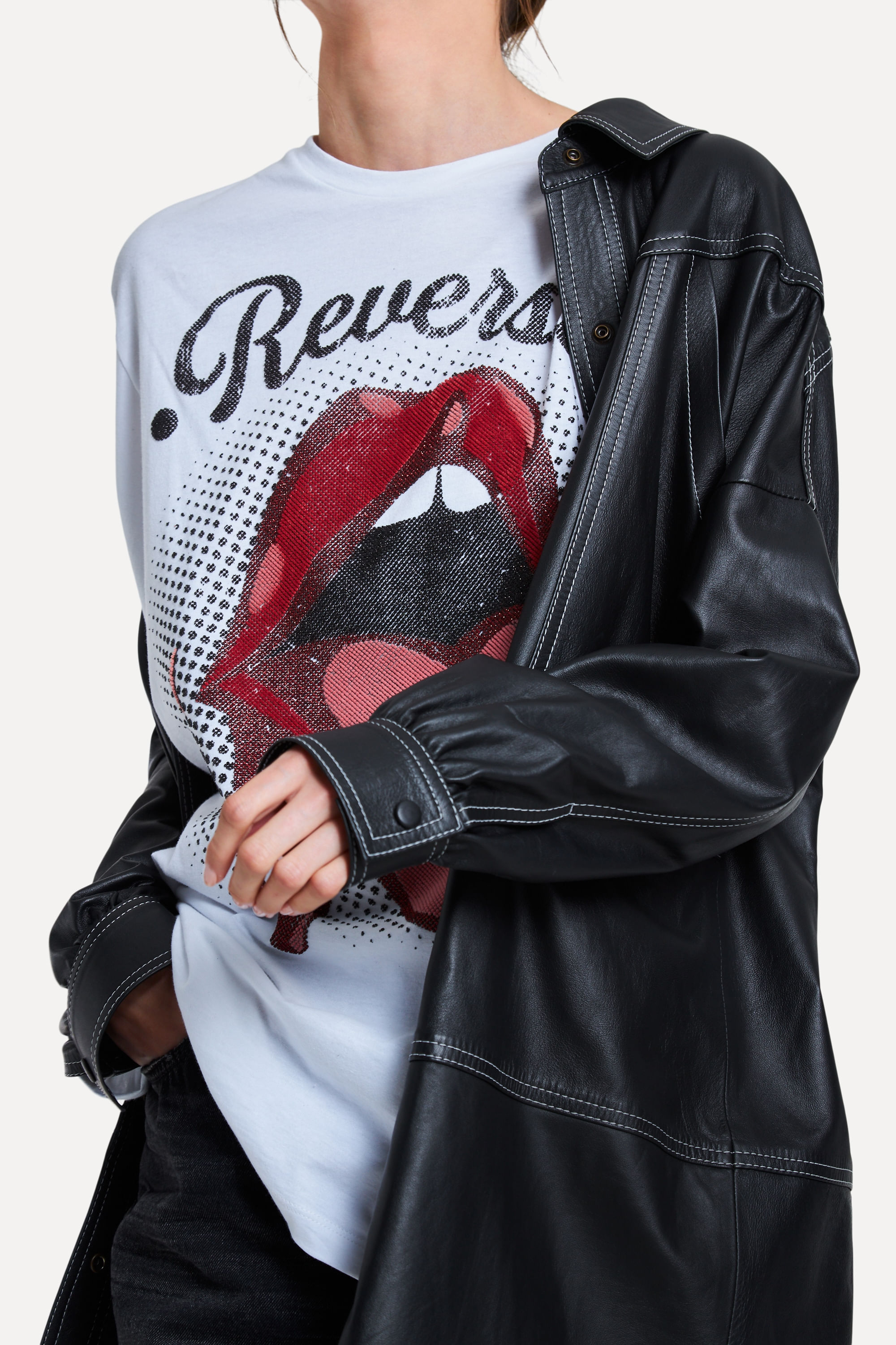 Comfy and cool! A camiseta silk reversa tones é de <b>algodão</b>, meia malha, e possui mangas curtas. Peça casual super versátil para composições urbanas. Experimente usar com partes de baixo mais elaboradas com cintura alta, sobreposições ou mesmo tricot, moletom ou couro.
