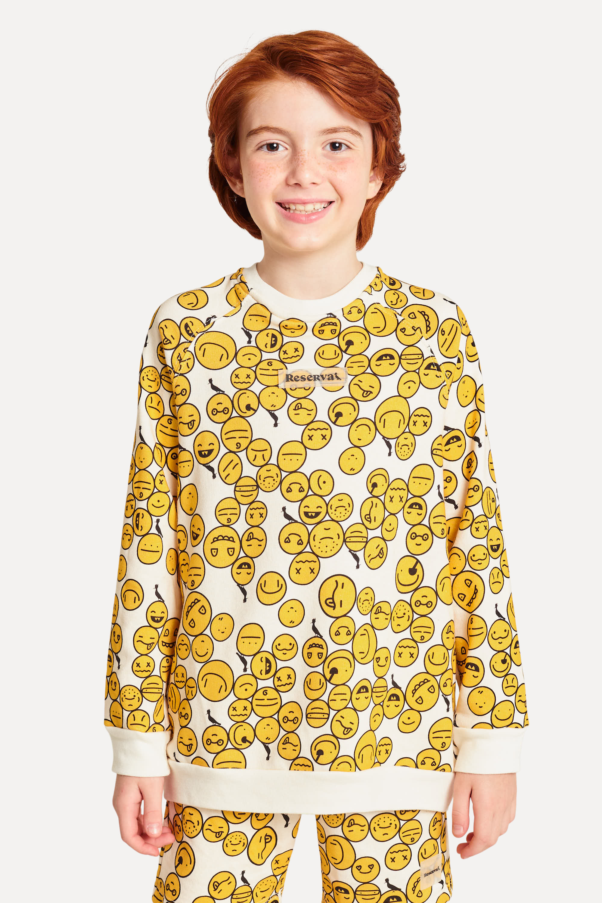 Casaco da linha infantil Reserva Mini. O modelo em moletom ganhou gola careca, cavas raglans e assinatura emborrachada. A estampa divertida de emojis é sucesso certo com a garotada! Produzido eticamente no Brasil. Comprando esta peça, você complementa cinco pratos de comida através do nosso programa 1P=5P.