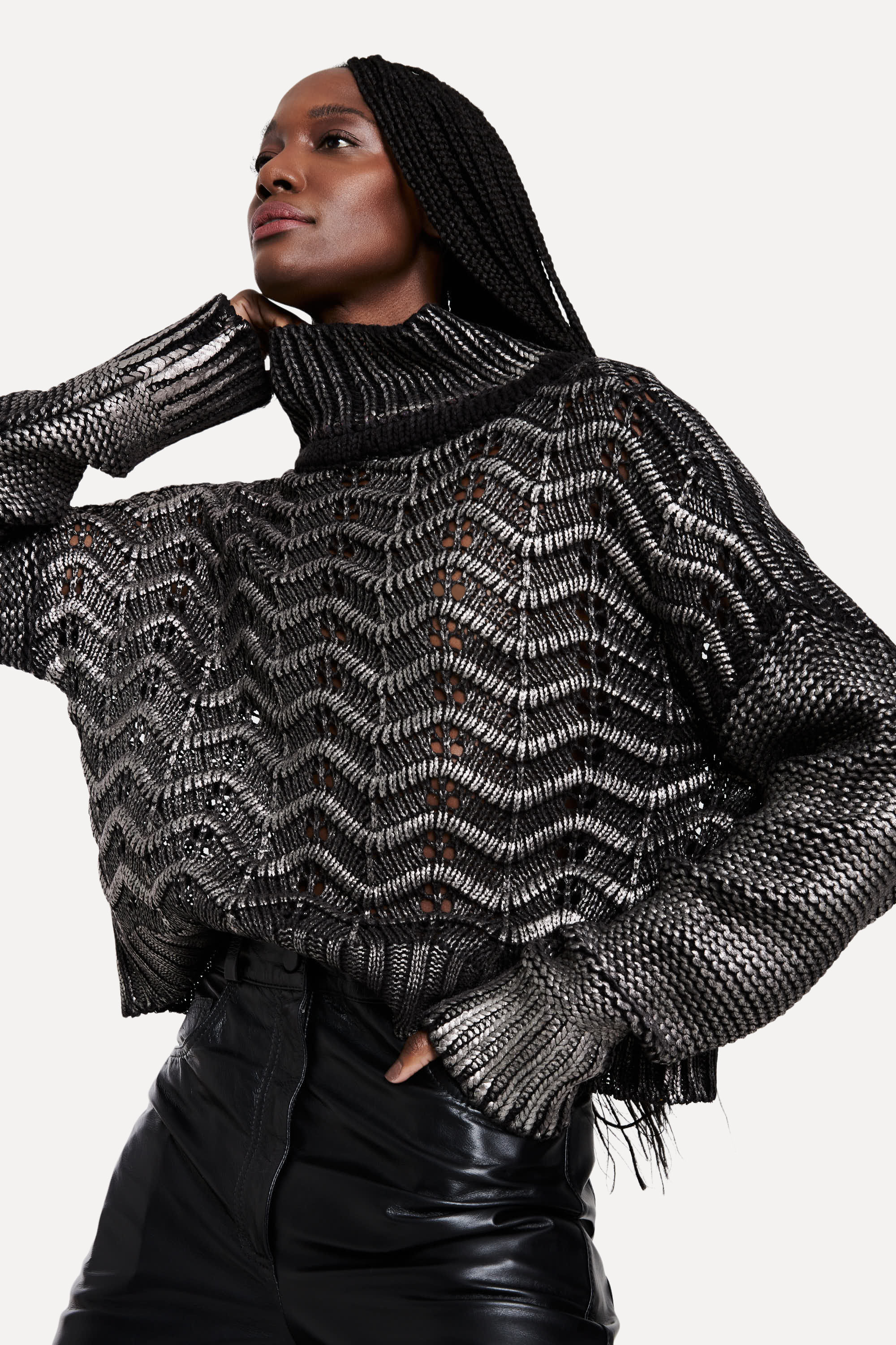 O Casaco Tricot Foil é uma peça linda e versátil, que além de resistente a temperaturas altas, é produzida com fio de fibra sintética que não esquece nem um detalhe. Com mix de pontos, o casaco tricot foil é aquecido no beneficiamento chamado foil, que consiste em aquecer o papel metalizado e a blusa para que o conteúdo do papel passe para o tecido, deixando a peça toda metalizada. Casaco Feminino Reversa produzido eticamente no Brasil. Comprando esta peça, você viabiliza cinco pratos de comida através do nosso programa 1P5P. A modelo mede 1,77 m de altura e 79 cm de busto.