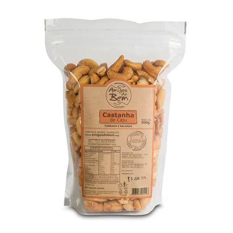 <strong>Castanha de Caju Torrada e Salgada Amigos do Bem 500g </strong> <p> <strong>A Castanha de caju torrada e salgada do Amigos do bem </strong>é produzida no sertão. Seu cultivo é atentamente acompanhado por profissionais capacitados, o que garante castanhas frescas, nutritivas e de alta qualidade. Castanha inteira do tipo 1, torrada e levemente salgada. </p> <strong>Sobre os ingredientes: </strong> <p><strong>Amêndoa da castanha-de-caju torrada: </strong>As castanhas, conhecidas também como oleaginosas, são ricas em gorduras boas, além de conter proteínas, vitaminas, minerais e fibras. </p> <p> </p> <p>ALÉRGICOS: CONTÉM CASTANHA DE CAJU; PODE CONTER: DERIVADOS DE SOJA, AMENDOIM, AMENDOAS E CASTANHA-DO-PARÁ. NÃO CONTÉM GLÚTEN.</p> <strong>Sugestão de consumo: </strong> <p>Ideal para os lanches entre as refeições e/ou petiscos</p> <strong> Motivos para escolher o produto: </strong> <ul> <li>Pode ser consumido nos lanches intermediários </li> <li>Fonte de gorduras boas</li> <li>Contém proteínas, vitaminas e minerais</li> <li>Sem glúten</li> <li>Prático para consumo</li> </ul> <strong>Sobre a marca:</strong> <p>Amigos do Bem é uma instituição sem fins lucrativos que desenvolve projetos educacionais, de geração de trabalho e renda, água, saúde e moradia no sertão do Nordeste brasileiro, promovendo, desde 1993, desenvolvimento local e inclusão social junto às populações em situação de extrema pobreza e miséria.</p>