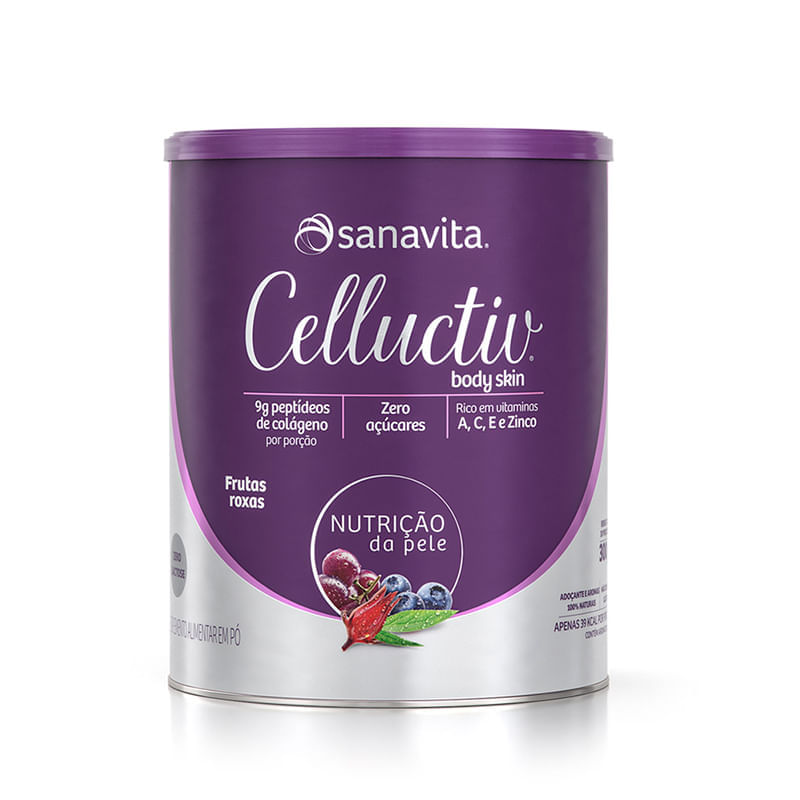 O Celluctiv® Body Skin sabor frutas roxas, da Sanavita, é um suplemento alimentar com formulação inovadora que combina 9g de peptídeos ativos de colágeno a substâncias antioxidantes e potencializadoras de colágeno.<br>Atende 100% das necessidades diárias das vitaminas A, C, E e o mineral zinco. Não possui adição de açúcar ou maltodextrina.<br>Sobre os ingredientes:<br>• Peptídeos de colágeno: é o colágeno reduzido em pequenas partículas, tornando a absorção pelo organismo mais fácil. Os aminoácidos presentes no colágeno compõem a estrutura de tecidos, tais como o da pele, ossos, cartilagens e ligamentos.<br>• Hibisco (Hibiscus sabdariffa): planta rica em antioxidantes, principalmente antocianinas. <br>• Polpa de frutas: polpas desidratadas, naturalmente rica em nutrientes e sabor.<br>• Vitaminas A, C, E e o mineral zinco: apresentam ação antioxidante que auxilia na proteção dos danos causados pelos radicais livres.<br>• Vitamina C: auxilia na formação do colágeno.<br>• Vitamina A e zinco: a vitamina A contribui para a manutenção da pele, e o zinco, além da pele, contribui para a manutenção do cabelo e das unhas.<br>Alérgicos:<br>Pode conter derivados de leite e de soja.<br>Recomendação de consumo:<br>Adicione 1 porção (10 g) em 100 mL de água e mexa até completa dissolução. <br>Sugere-se o consumo de 1 porção ao dia. <br>Por que escolher este produto?<br>• Sem glúten<br>• Sem lactose<br>• 39 kcal na porção<br>• Livre de conservantes, corantes ou aromas artificiais<br>• Não contém maltodextrina<br>• Baixo índice glicêmico<br>• Low carb<br>• Baixo FODMAP<br>• Adoçado com stévia<br>Sobre a marca: <br>A Sanavita é uma das principais empresas produtoras de alimentos saudáveis do Brasil, especializada no desenvolvimento de alimentos funcionais e especiais. Graças a excelente qualidade de seus produtos e à sua origem científica, conquistou a fidelidade dos profissionais de saúde e dos consumidores em todo o país.