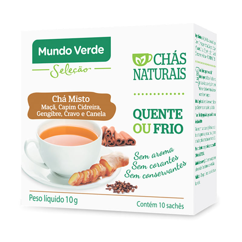 <p>O <strong>Chá Gengibre Maçã Cravo Canela Mundo Verde Seleção 10g com 10 Sachês</strong> é produzido com maçã e especiarias. Sem conservantes ou corantes artificiais.</p> Sugestão de consumo: <p>Coloque 1 sachê de chá em uma xícara, despeje a água quente, mas não fervendo, e deixe em infusão até que o sabor e aroma estejam de sua preferência.</p> Motivos para escolher o produto: <ul> <li> <p>Produto prático</p> </li> <li> <p>Produto 100% natural</p> </li> <li> <p>Livre de corantes artificiais</p> </li> <li> <p>Livre de conservantes</p> </li> <li> <p>Sem glúten</p> </li> <li> <p>Sem açúcar</p> </li> <li> <p>Sem gordura trans</p> </li> </ul> Sobre a marca: <p>A <strong>Mundo Verde Seleção</strong> é uma linha de produtos para quem quer ter uma vida mais saudável e gostosa. A marca quer ajudar a colocar essas escolhas em prática. A paixão e conhecimento pelos alimentos, nutrientes, aromas e sabores permitem a seleção das melhores opções saudáveis para qualquer ocasião. Conheça a linha completa <strong>Mundo Verde Seleção</strong>, com inúmeros produtos saudáveis e gostosos para facilitar seu dia a dia.</p>