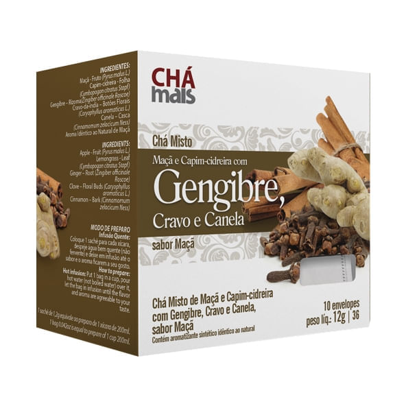 Informações técnicas do produto:<br> O Chá Maçã e capim cidreira com gengibre, cravo e canela, da Chá mais, é uma deliciosa bebida, com sabor marcante para apreciar no seu dia.<br> <br> Recomendações de consumo:<br> Este chá pode ser consumido morno, quente ou frio, de acordo com sua preferência. É aconselhável a infusão de um sachê em 200 mL de água quente, até o aroma e sabor do chá ficarem a seu gosto.<br> <br> Por que escolher esse produto?<br> Sem glúten<br> Natural<br> Livre de açúcares<br> Zero aromatizantes<br> Não contem gorduras trans<br> Sobre a marca:<br> A Chá Mais é uma empresa que está há muitos anos no mercado de produtos naturais, com um portfólio vasto, engloba produtos como suplementos alimentares, nutracêuticos, chás, encapsulados, shakes e cereais. Conta também com uma linha de produtos funcionais produzida com os melhores ingredientes, proporcionando excelentes resultados.