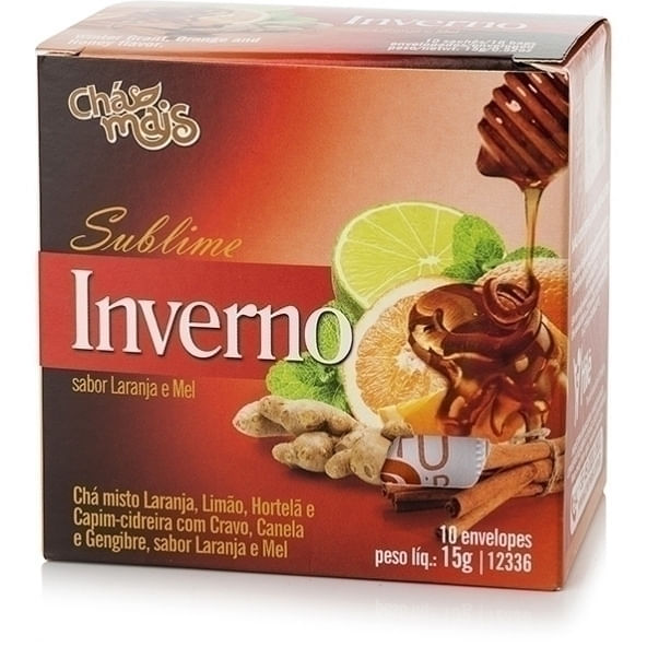 Informações técnicas do produto:<br> O Chá Misto Sublime Inverno, Chá Mais, é composto por casca de laranja, canela, gengibre, hortelã, capim cidreira e cravo-da-índia, uma combinação ideal para ser consumida na época mais fria do ano.<br> <br> Por que escolher esse produto?<br> Com ingredientes naturais<br> Sem conservantes e corantes artificiais<br> Com 10 sachês<br> Delicioso aroma de laranja e mel<br> Sem açúcar<br> Recomendação de consumo:<br> Coloque um sachê de chá para cada xícara, despeje água quente e abafe até que a infusão fique ao seu gosto.<br> <br> Sobre a marca: <br> A Chá Mais é uma empresa que está há muitos anos no mercado de produtos naturais, sendo uma das maiores no ramo e referência no Brasil. Com um portfólio vasto, engloba produtos como suplementos alimentares, nutracêuticos, chás, encapsulados, shakes e cereais. Conta também com uma linha de produtos funcionais produzida com os melhores ingredientes.