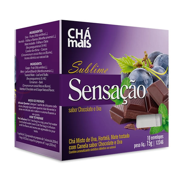 Informações técnicas do produto:<br> O Chá Misto Sublime Sensação, da Chá Mais tem apenas 5 ingredientes, a uva (Vitis vinifera L.), os ramos e folhas de hortelã (Mentha arvensis L.), folhas e talos de mate tostado (Ilex paraguariensis St Hil.) e a canela da china em cascas (Cinnamomum cassia Ness ex Blume), o aroma é idêntico ao natural de chocolate de uva, além disso é um chá livre de glúten e isento de lactose, podendo ser consumido por intolerantes.<br> <br> Recomendação de consumo:<br> Este chá pode ser consumido quente ou frio conforme a preferência, é recomendado a infusão do sachê em água fervente até que o sabor e aroma fiquem agradáveis ao seu paladar.<br> <br> Por que escolher esse produto?<br> Livre de glúten<br> Isento de lactose<br> Ingredientes naturais<br> Zero gorduras trans<br> Sem adição de açúcar<br> Sobre a marca: <br> A Chá Mais é uma empresa que está há muitos anos no mercado de produtos naturais, sendo uma das maiores no ramo e referência no Brasil. Com um portfólio vasto, engloba produtos como suplementos alimentares, nutracêuticos, chás, encapsulados, shakes e cereais. Conta também com uma linha de produtos funcionais produzida com os melhores ingredientes.