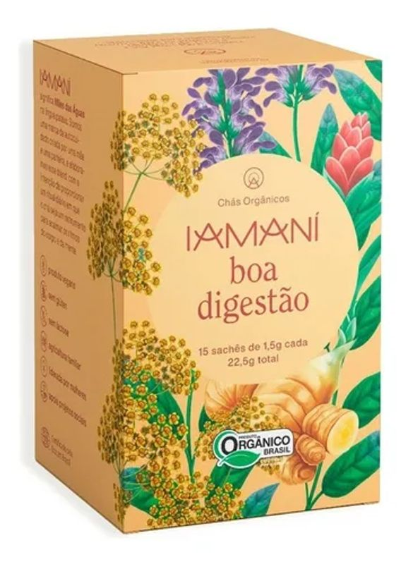 Descubra o segredo para uma digestão saudável e um bem-estar completo com o Chá orgânico Iamani Boa Digestão. Este blend exclusivo, 100% natural e orgânico, oferece alívio e conforto, transformando seus momentos pós-refeição em pura leveza. Ideal para quem busca uma solução eficaz e consciente para o equilíbrio digestivo.<br /> <br /> Poder da Natureza em Cada Gole<br /> <br /> O Chá orgânico Iamani Boa Digestão é uma fusão perfeita de ingredientes selecionados: Erva Doce, Funcho, Laranja, Sálvia e Gengibre. Cada componente é escolhido por suas propriedades que promovem a saúde digestiva, oferecendo um sabor herbal suave com notas cítricas. É a escolha ideal para quem valoriza a pureza e a eficácia dos produtos naturais.<br /> <br /> Benefícios para o seu Bem-Estar Diário<br /> <br /> Este poderoso blend oferece suporte digestivo completo. Suas propriedades calmantes e antiespasmódicas ajudam a aliviar desconfortos gastrointestinais, enquanto ingredientes termogênicos ativam o metabolismo. Desfrute de uma sensação de leveza e vitalidade a cada xícara do seu Chá orgânico Iamani Boa Digestão, promovendo um equilíbrio interno essencial para o seu dia a dia.<br /> <br /> Compromisso com a Saúde e o Planeta<br /> <br /> Certificado como orgânico, o Chá orgânico Iamani Boa Digestão é totalmente vegano, sem glúten, sem lactose e zero açúcar. Livre de aromas sintéticos, agrotóxicos e conservantes, é perfeito para dietas restritivas. Além disso, a embalagem é totalmente biodegradável, com sachês de fibras naturais e celofane de celulose, reforçando o compromisso da marca Boa Digestão com a sustentabilidade e o meio ambiente.
