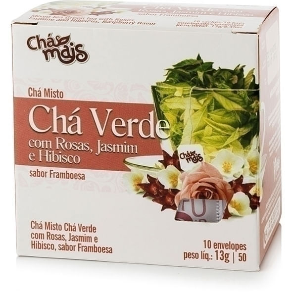 Informações técnicas do produto:<br> A Chá Mais apresenta mais uma ótima de opção de chá. Essa composição possui chá verde, rosas, jasmim e hibisco e ainda apresenta sabor de framboesa. O chá verde é produzido das folhas da planta da Camellia sinensis, sofrendo pouca oxidação durante o seu processamento.<br> <br> Recomendação de consumo: <br> O Chá verde com rosas, jasmim e hibisco possui um sabor agradável de framboesa, é muito prático de preparar e pode ser consumido a qualquer hora do seu dia. <br> <br> Sobre a marca: <br> A Chá Mais é uma empresa que está há muitos anos no mercado de produtos naturais, sendo uma das maiores no ramo e referência no Brasil. Com um portfólio vasto, engloba produtos como suplementos alimentares, nutracêuticos, chás, encapsulados, shakes e cereais. Conta também com uma linha de produtos funcionais produzida com os melhores ingredientes.