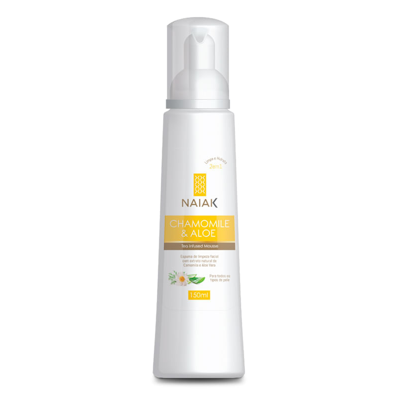 <p>A <strong>Chamomile e Aloe Espuma Facial de Limpeza Naiak 150ml</strong>, é uma espuma de limpeza facial indicada para todos os tipos de pele. A limpeza da pele é uma das etapas mais importantes na rotina de skin care. O Chamomile & Aloe - Tea Infused Mousse promove a limpeza suave sem remover a barreira de proteção natural da pele, seus ativos naturais selecionados possuem ação calmante e hidratante evitando assim o ressecamento, ideal para todos os tipos de pele.</p> <p>Por possuir em sua composição azuleno, alfa bisabolol, flavonóides, terpenos e taninos a camomila apresenta propriedades anti-inflamatória, antioxidante, calmante, emoliente e cicatrizante. A presença de alfa bisabolol na camomila a torna poderosa nos processos regenerativos e antioxidantes da pele, auxiliando na redução de manchas e linhas de expressão. Por possuir ação anti-inflamatória ajuda a combater a má circulação e inflamações reduzindo assim, irritações e vermelhidão da pele.</p> Sobre os ingredientes: <p>Aqua; Decyl Glucoside; Sodium Cocoyl Sarcosinate; Cocomidopropyl Betaine; Peg-120 Methyl Glucose Dioleate; Glycerin; Aloe Barbadensis Extract; Chamomilla Recutita Flower Extract; Panthenol; Caprilhydroxamic Acid, Caprylyl Glycol, Glycerin; Disodium Edta.</p> Sugestão de consumo: <p>Coloque uma pequena quantidade de produto na palma da mão. Massageie com movimentos circulares por todo rosto e pescoço. Retire com água fria ou morna.</p> Motivos para escolher o produto: <ul> <li> <p>Hipoalergênico</p> </li> <li> <p>Livre de parabenos</p> </li> <li> <p>Sem perfume</p> </li> <li> <p>Sem corantes</p> </li> <li> <p>Vegano</p> </li> <li> <p>Não testado em animais</p> </li> <li> <p>2 em 1 – Limpa e hidrata</p> </li> <li> <p>Ação Calmante</p> </li> <li> <p>Para todos os tipos de pele</p> </li> </ul> Sobre a marca: <p>A <strong>Naiak</strong> é uma empresa farmacêutica, de origem brasileira, que oferece uma linha completa de produtos nutracêuticos e alimentos funcionais voltados para a beleza e o bem-estar. Buscam cuidar da saúde de dentro para fora. Extraem seus ativos da natureza que em conjunto com a sua alta tecnologia oferecem produtos os quais contribuem para a vitalidade, qualidade de vida e autoestima.</p>