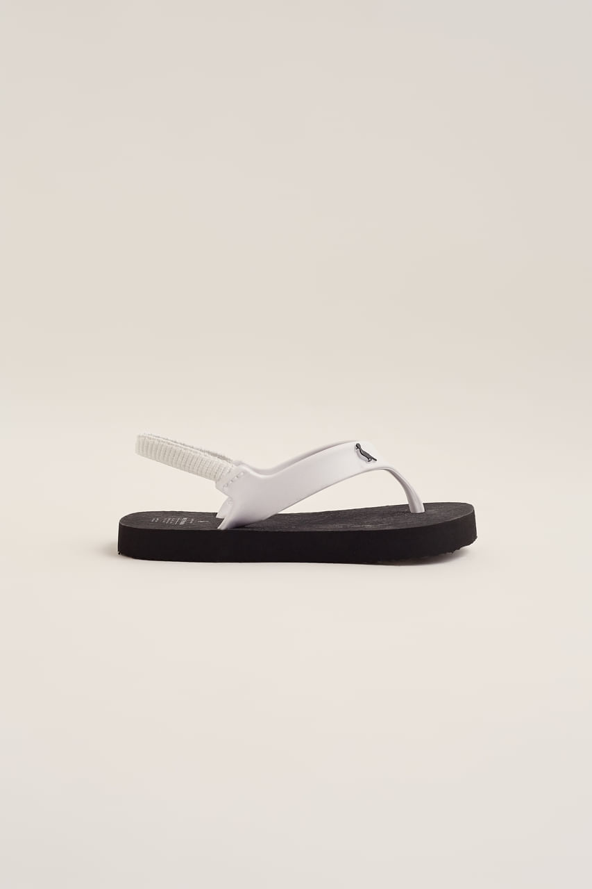 Chinelo da linha infantil Reserva Mini para bebês. O modelo de borracha em preto e branco ganhou elástico no calcanhar dando maior conforto aos primeiros passos dos nenéns!