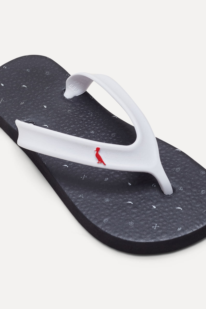 Chinelo da linha infantil Reserva Mini. O modelo básico tem tira em cor lisa e solado com estampa de símbolos. Super confortável para usar nas praias, piscinas ou até fora delas em momentos de relax. Produzido eticamente no Brasil. Comprando esta peça, você complementa cinco pratos de comida através do nosso programa 1P=5P.