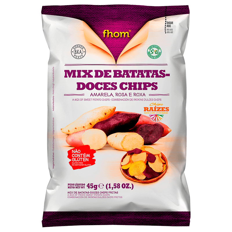 <p>Os <strong>Chips de Batata doce Rosada e Roxa,</strong> da <strong>Fhom</strong>, são chips feiros com apena cinco ingredientes 100% natural. São livres de conservantes, zero gordura trans e feitos com sal light. Possui o selo Kosher, ou seja, é feito de acordo com os preceitos judaicos.</p> <strong>Por que escolher esse produto? </strong> <ul> <li>100% natural</li> <li>Isento de glúten</li> <li>Zero gordura trans</li> <li>Feito com sal light</li> <li>Sem colesterol</li> <li>Livres de conservantes</li> <li>Selo Kosher</li> <li>Certificado da Sociedade Vegetariana Brasileira</li> </ul> A marca: <p></p> <p>A Fhom, é uma empresa criada em 1994, que possui como objetivo fornecer produtos de qualidade superior aos clientes, respeitando princípios como inovação tecnológica, apresentação diferenciada e extremo cuidado na fabricação. Atualmente possui produtos com certificado orgânico ECOCERT e SVB, além de todos serem feitos com o mais restrito controle, para garantir a não contaminação com glúten, lactose e outros ingredientes alergênicos.</p>