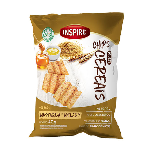 O Chips Multicereais Mostarda e Melado, da Inspira, 40g, é um delicioso snack salgado, produzido com melado, farinha de milho, de arroz, de trigo integral e de aveia. Sem adição de lácteos ou ovos, é um produto vegetariano.