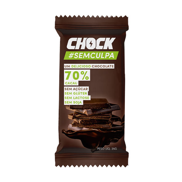 <p>Informações técnicas do produto:<br>Chock sem culpa 70%, 25 g, da Chock, é uma barrinha de chocolate feita a partir de ingredientes naturais, possui o puro cacau 70%, além disso, sua composição é livre de açúcar, glúten, lactose e soja.<br><br>Recomendação de consumo:<br>Uma opção de doce saudável que pode ser consumida a qualquer hora do dia, principalmente como sobremesa!<br><br>Por que escolher esse produto?<br>Sem açúcar<br>Sem glúten<br>Sem lactose<br>Sem soja<br>70% cacau<br>Sobre a marca:<br>A Chock é uma empresa que tem como missão melhorar a vida das pessoas através da alimentação saudável, gostosa e sem culpa! Os produtos são feitos com tecnologia e ingredientes de alta qualidade, tudo isso visando oferecer opções saborosas e saudáveis ao consumidor.<br><br></p>