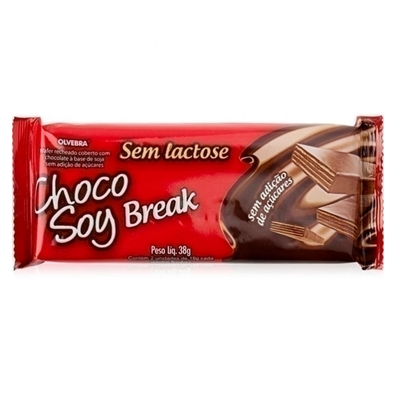 <p><strong>Choco Soy Break Zero, da Olvebra</strong> é um delicioso wafer com recheio de avelã, coberto com chocolate sem lactose e sem adição de açúcares.</p> <p>Por ser isento lactose (o carboidrato do leite) e de caseína (a proteína do leite de vaca) é uma deliciosa alternativa para intolerantes ou alérgicos ao leite.</p> Sobre os ingredientes: <ul> <li>Soja: utiliza-se a soja para o preparo do chocolate. A forma utilizada é o extrato de soja. O extrato de soja é elaborado a partir do grão de soja moído e desidratado. O extrato de soja é fonte de cálcio, rico em fibras, proteínas e vitaminas do complexo B. Fonte natural de isoflavonas e gorduras poliinsaturadas.</li> </ul> <p>AVISO: Produto frágil e sujeito a danos durante o transporte!</p>