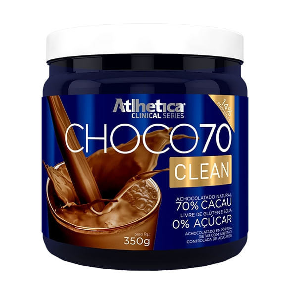 Informações técnicas do produto:<br> O Choco70 Clean, 350g, Atlhetica, é um achocolatado saudável, possui 70% de cacau em sua fórmula, além do seu elevado teor de proteínas. É livre de açúcares, maltodextrina sendo adoçado naturalmente com Stévia.<br> <br> Recomendação de consumo:<br> Utilizar 20g (2 colheres de sopa) em 200ml de leite de sua preferência. Homogeneizar e ingerir imediatamente após o preparo.<br> <br> Por que escolher esse produto?<br> Sem adição de açúcar<br> Contém 70% de cacau<br> Sem glúten<br> Com 14% de proteínas<br> Fonte de fibras<br> Prático para o consumo