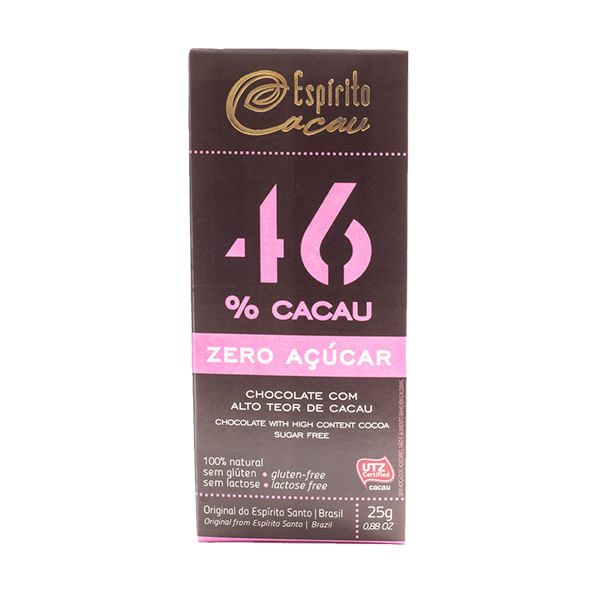O Chocolate 46% cacau zero açúcar, da Espírito Cacau, traz o equilíbrio perfeito entre o doce e o alto teor de cacau. Sem lactose, é feito com apenas 4 ingredientes naturais selecionados, sem adição de corantes, conservantes ou aromatizantes. Delicioso chocolate 100% natural, rico em sabor e aroma, não utiliza gordura hidrogenada, ainda é livre de glúten.