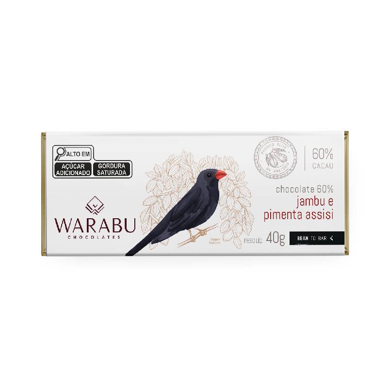 <p>O <strong>chocolate Wabaru 60% cacau</strong> é feito com <strong>jambu</strong>, <strong>pimenta assisi</strong> e outros ingredientes naturais selecionados, livres de glúten e de lactose. Cada mordida proporciona uma explosão de sabores.</p> <h2><strong>Sugestão de consumo:</strong></h2> <p>Super versátil, o chocolate Wabaru pode ser consumido como sobremesa ou fazendo parte de receitas culinárias.</p> <h2><strong>Motivos para escolher o produto:</strong></h2> <ul> <li> <p>Embalagem com 40g;</p> </li> <li> <p>Clean-label;</p> </li> <li> <p>Sem OGM (organismos geneticamente modificados);</p> </li> <li> <p>Sem conservantes, adoçantes e aromas artificiais;</p> </li> <li> <p>Livre de glúten, soja e leite;</p> </li> <li> <p>Feito com o método Bean to bar: utiliza poucos ingredientes, resultando em um chocolate mais puro, pouco processado, muito mais saboroso e nutritivo.</p> </li> </ul> <h2><strong>A Marca</strong></h2> <p>A Wabaru foi fundada pelo chef e empresário Jorge Neves no ano de 2018, a marca nasceu com o propósito de resgatar a cultura do cultivo do cacau na Amazônia. Cada chocolate é desenvolvido com cacau selvagem orgânico, de espécie nativa, situada na bacia Amazônica, garantindo um chocolate rico em sabor, responsabilidade e compromisso com a natureza e as pessoas que nela vivem.</p> <p> </p>