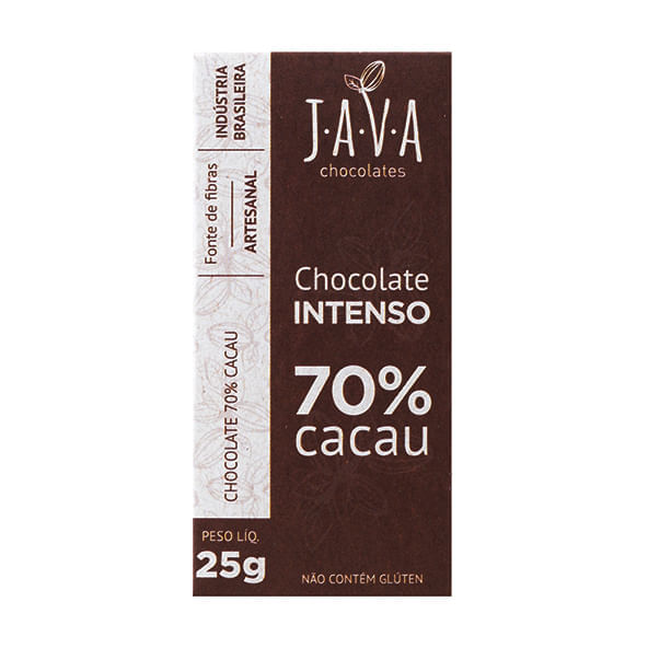 O Chocolate 70% Cacau Intenso 25g, da Java Chocolate tem o mais puro cacau 70%, e pela concentração que o chocolate apresenta, tem o sabor de amargor, além de textura aveludada, sem adição de açúcar. São utilizados poucos ingredientes para fazer um chocolate de verdade.