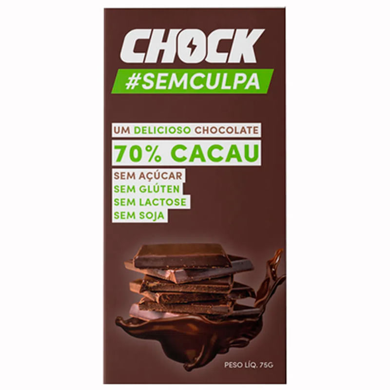 <p>Informações técnicas do produto:<br><br>Chock Sem Culpa 70%, 75 g, da Chock, é uma barrinha de chocolate saudável e funcional, feita a partir de ingredientes naturais, possui o puro cacau 70%.<br><br>Além disso, sua composição é livre de açúcar, glúten, lactose e soja. Para você que deseja saborear um delicioso chocolate sem culpa, não deixe de experimentar!<br><br>Sobre os ingredientes:<br><br>Confira mais detalhes de alguns ingredientes presentes em sua composição:<br><br>Chocolate 70%: Possui uma maior concentração de cacau em sua composição.<br>Maltitol: Um bom substituto para o açúcar refinado, possui calorias reduzidas e não provoca cáries.<br>Recomendação de consumo:<br><br>Uma boa opção para saciar a vontade de comer doce sem deixar de lado a preocupação com a saúde, pode ser consumido após as principais refeições ou a qualquer hora do dia.<br><br>Por que escolher esse produto?<br>Sem açúcar<br>Sem glúten<br>Sem lactose<br>Sem soja<br>70% cacau<br>Sobre a marca:<br><br>A Chock é uma empresa que tem como missão melhorar a vida das pessoas através da alimentação saudável, gostosa e sem culpa! Os produtos são feitos com tecnologia e ingredientes de alta qualidade, tudo isso visando oferecer opções saborosas e saudáveis ao consumidor.<br><br></p>
