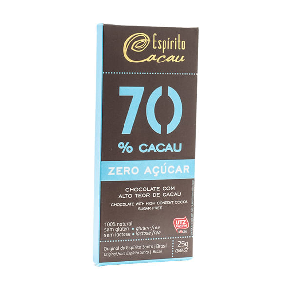 O Chocolate 70% cacau zero açúcar, da Espírito Cacau, é um delicioso chocolate 100% natural, adoçado com maltitol. Sem lactose, é feito com apenas 3 ingredientes, sem adição de corantes, conservantes ou aromatizantes. Rico em sabor e aroma, não utiliza gordura hidrogenada, ainda é livre de glúten.
