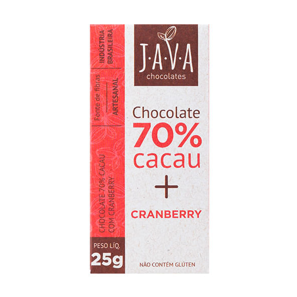 O Chocolate 70% Cacau com Cranberry 25g, da Java Chocolate é um produto 100% brasileiro, feito a partir do cacau de origem amazônica, que apresenta uma textura aveludada que derrete na boca espalhando um sabor equilibrado e marcante.