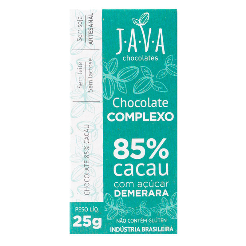 <p>O Chocolate 85% Cacau Demerara Complexo 25g, da Java Chocolate é feito com chocolate 85%, o produto da linha com maior teor de cacau. É um chocolate adoçado com açúcar demerara, e pela concentração de cacau que apresenta, tem um sabor mais amargo em relação aos outros sabores.</p>